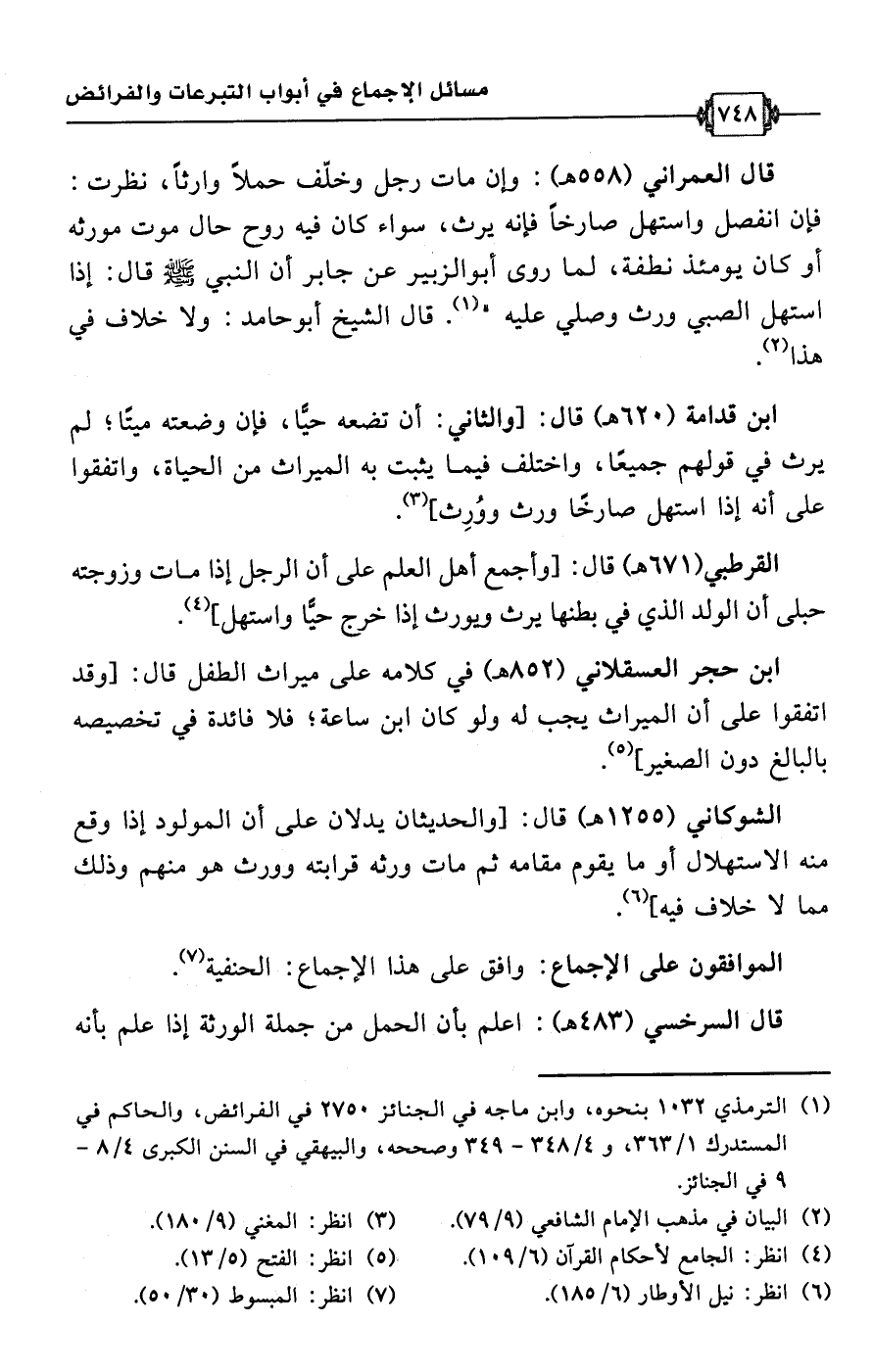 القرطبي (671 هـ) قال: [وأجمع أهل العلم على أن الرجل إذا مات وزوجته حبلى أن الولد الذي في بطنها يرث ويورث إذا خرج حيًّا واستهل] (¬4).