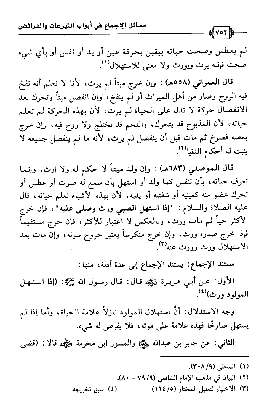قال الموصلي (683 هـ): وإن ولد ميتًا لا حكم له ولا إرث، وإنما تعرف حياته، بأن تنفس كما ولد أو استهل بأن سمع له صوت أو عطس أو تحرك عضو منه كعينيه أو شفتيه أو يديه, لأن بهذه الأشياء تعلم حياته، قال عليه الصلاة والسلام: "إذا استهل الصبي ورث وصلى عليه"، فإن خرج الأكثر حيًا ثم مات ورث، وبالعكس لا اعتبار للأكثر، فإن خرج مستقيمًا فإذا خرج صدره ورث، وإن خرج منكوسًّا يعتبر خروج سرته، وإن مات بعد الاستهلال ورث وورث عنه (¬3).