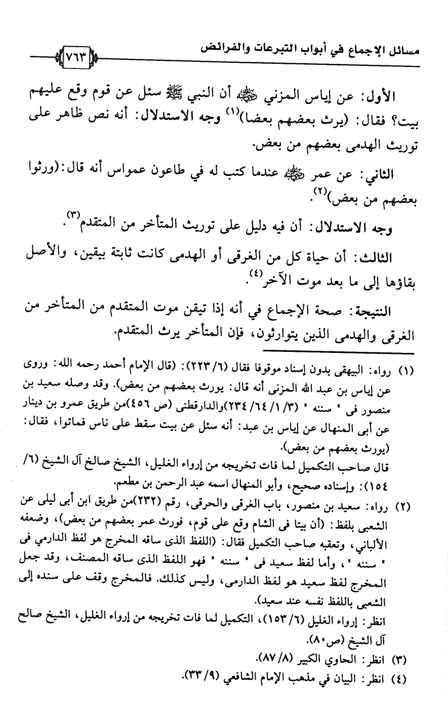 الثالث: أن حياة كل من الغرقى أو الهدمى كانت ثابتة بيقين، والأصل بقاؤها إلى ما بعد موت الآخر (¬4).Rصحة الإجماع في أنه إذا تيقن موت المتقدم من المتأخر من الغرقى والهدمى الذين يتوارثون، فإن المتأخر يرث المتقدم.