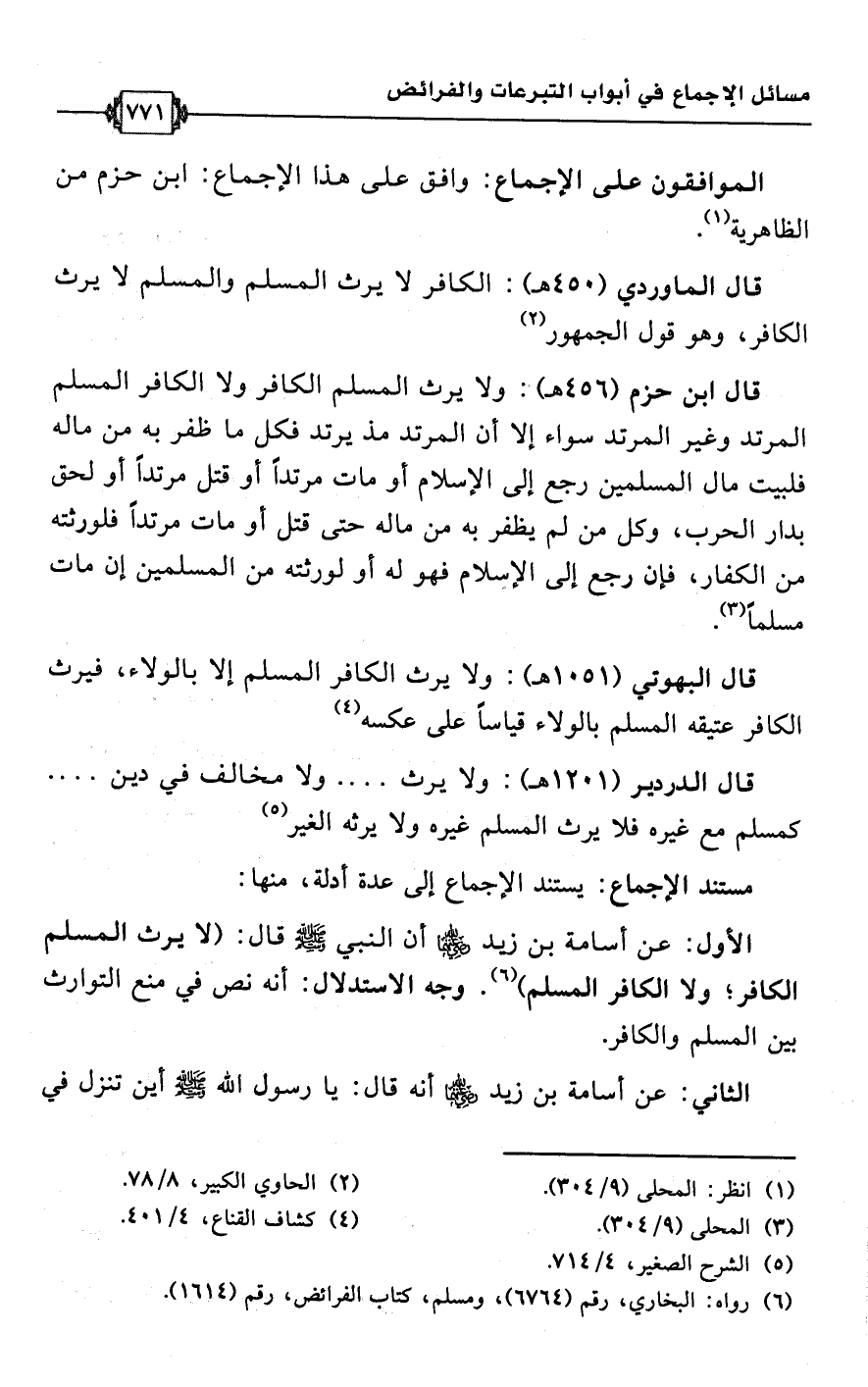 قال ابن حزم (456 هـ): ولا يرث المسلم الكافر ولا الكافر المسلم المرتد وغير المرتد سواء إلا أن المرتد مد يرتد فكل ما ظفر به من ماله فلبيت مال المسلمين رجع إلى الإسلام أو مات مرتدًا أو قتل مرتدًا أو لحق بدار الحرب، وكل من لم يظفر به من ماله حتى قتل أو مات مرتدًا فلورثته من الكفار، فإن رجع إلى الإسلام فهو له أو لورثته من المسلمين إن مات مسلمًا (¬3).