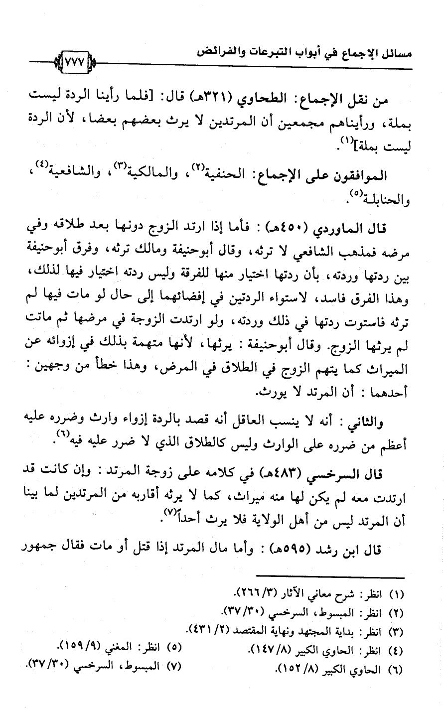 • من نقل الإجماع: الطحاوي (321 هـ) قال: [فلما رأينا الردة ليست بملة، ورأيناهم مجمعين أن المرتدين لا يرث بعضهم بعضًا, لأن الردة ليست بملة] (¬1).