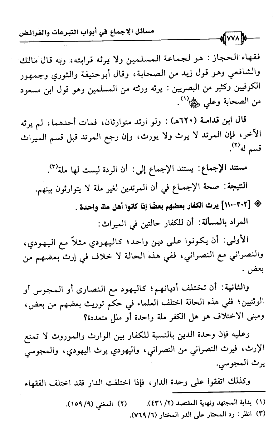 • مستند الإجماع: يستند الإجماع إلى: أن الردة ليست لها ملة (¬3).Rصحة الإجماع في أن المرتدين لغير ملة لا يتوارثون بينهم.