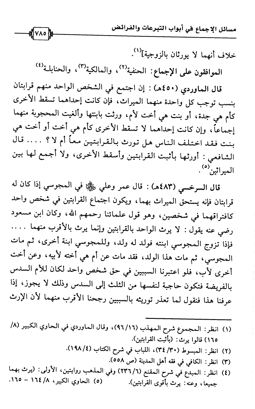 قال السرخسي (483 هـ): قال عمر وعلي -رضي اللَّه عنهما- في المجوسي إذا كان له قرابتان فإنه يستحق الميراث بهما، ويكون اجتماع القرابتين في شخص واحد كافتراقهما في شخصين، وهو قول علمائنا رحمهم اللَّه، وكان ابن مسعود رضي عنه يقول: لا يرث الواحد بالقرابتين وإنما يرث بالأقرب منهما. . . فإذا تزوج المجوسي ابنته فولد له ولد، وللمجوسي ابنة أخرى، ثم مات المجوسي، ثم مات هذا الولد، فقد مات عن أم هي أخته لأبيه، وعن أخت أخرى لأب، فلو اعتبرنا السببين في حق شخص واحد لكان للأم السدس بالفريضة فتكون حاجبة لنفسها من الثلث إلى السدس وذلك لا يجوز، إذا عرفنا هذا فنقول لما تعذر توريثه بالسببين رجحنا الأقرب منهما لأن الإرث