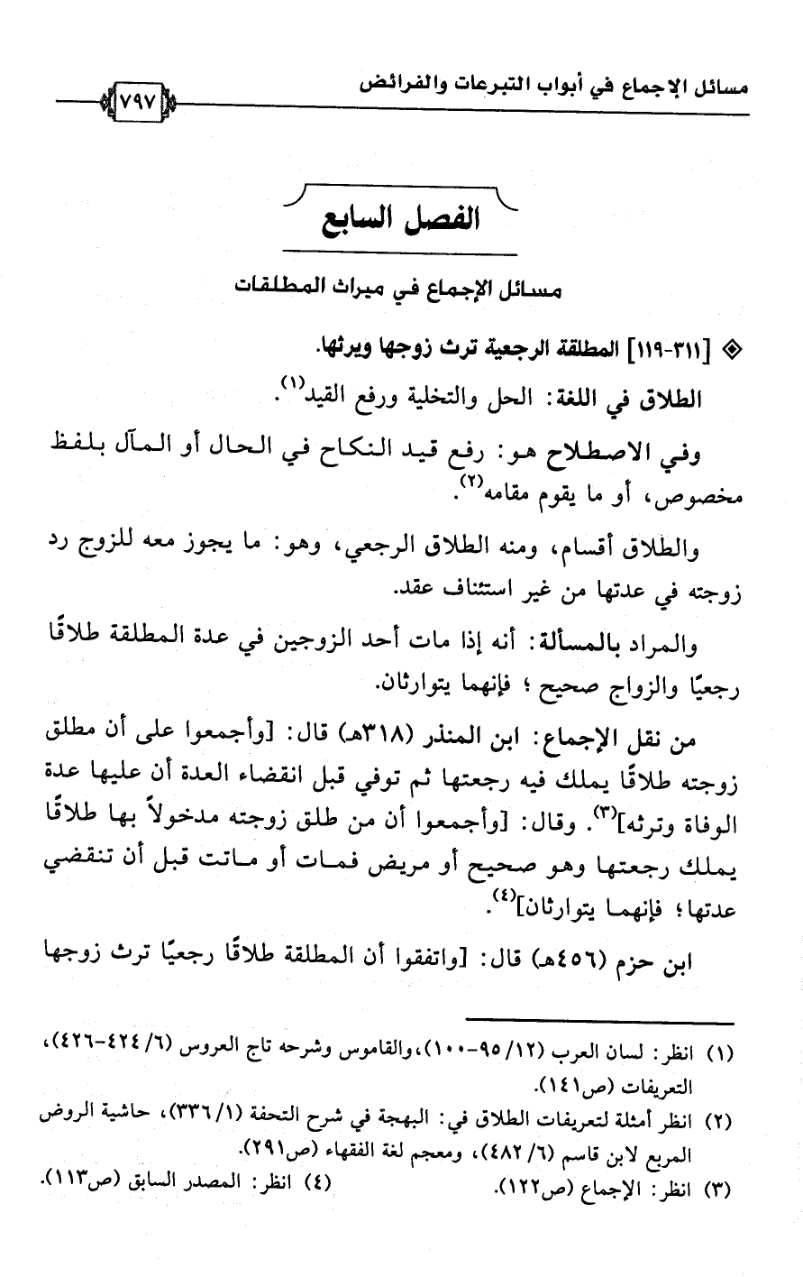 • من نقل الإجماع: ابن المنذر (318 هـ) قال: [وأجمعوا على أن مطلق زوجته طلاقًا يملك فيه رجعتها ثم تُوفِّي قبل انقضاء العدة أن عليها عدة الوفاة وترثه] (¬3). وقال: [وأجمعوا أن من طلق زوجته مدخولًا بها طلاقًا يملك رجعتها وهو صحيح أو مريض فمات أو ماتت قبل أن تنقضي عدتها؛ فإنهما يتوارثان] (¬4).