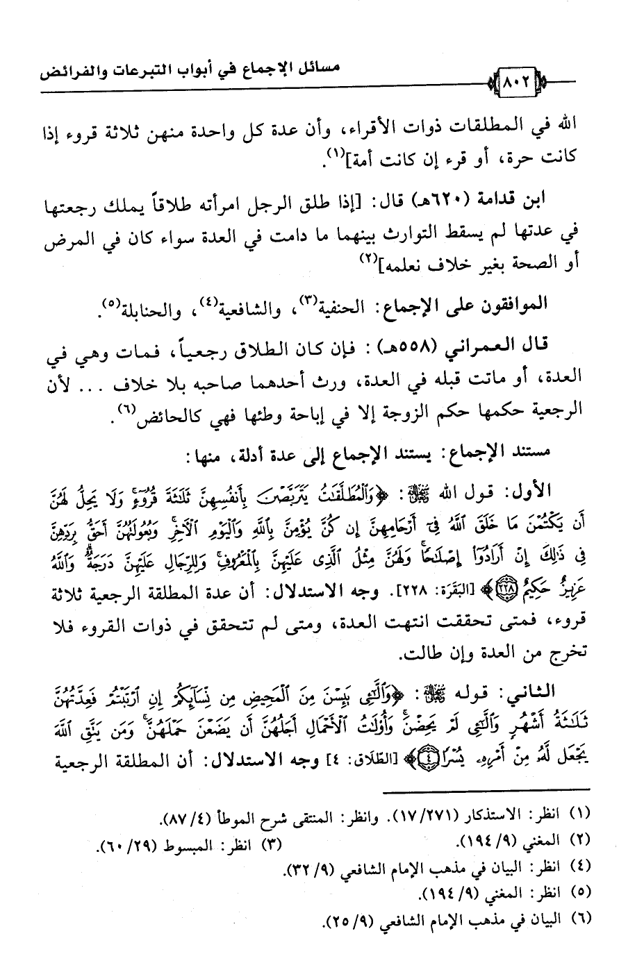 ابن قدامة (620 هـ) قال: [إذا طلق الرجل امرأته طلاقًا يملك رجعتها في عدتها لم يسقط التوارث بينهما ما دامت في العدة سواء كان في المرض أو الصحة بغير خلاف نعلمه] (¬2).