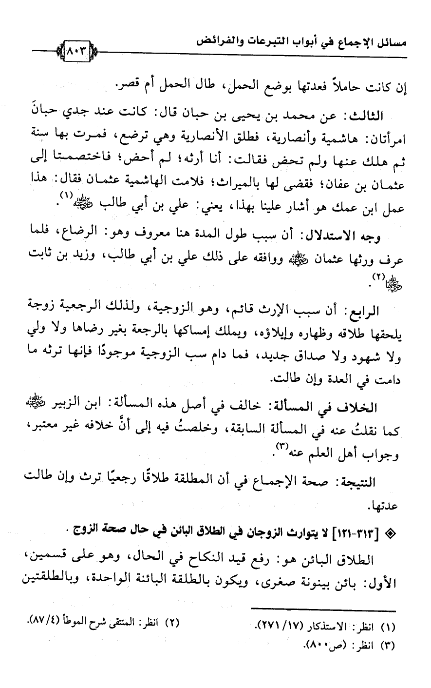 • الخلاف في المسألة: خالف في أصل هذه المسألة: ابن الزبير -رضي اللَّه عنه- كما نقلت عنه في المسألة السابقة، وخلصت فيه إلى أنَّ خلافه غير معتبر، وجواب أهل العلم عنه (¬3).Rصحة الإجماع في أن المطلقة طلاقًا رجعيًا ترث وإن طالت عدتها.