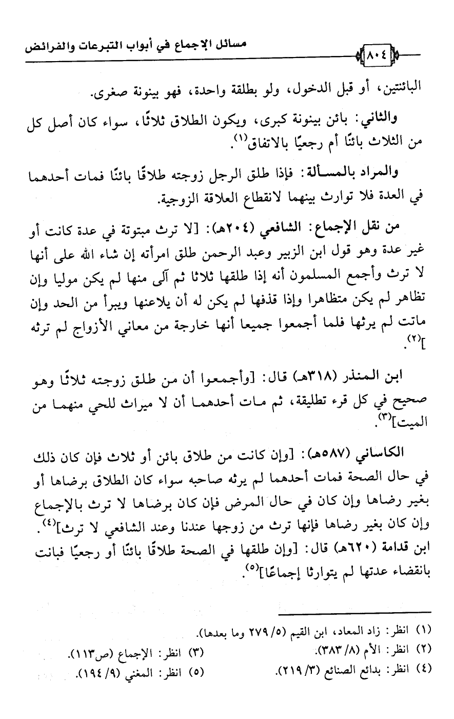 ابن المنذر (318 هـ) قال: [وأجمعوا أن من طلق زوجته ثلاثًا وهو صحيح في كل قرء تطليقة، ثم مات أحدهما أن لا ميراث للحي منهما من الميت] (¬3).