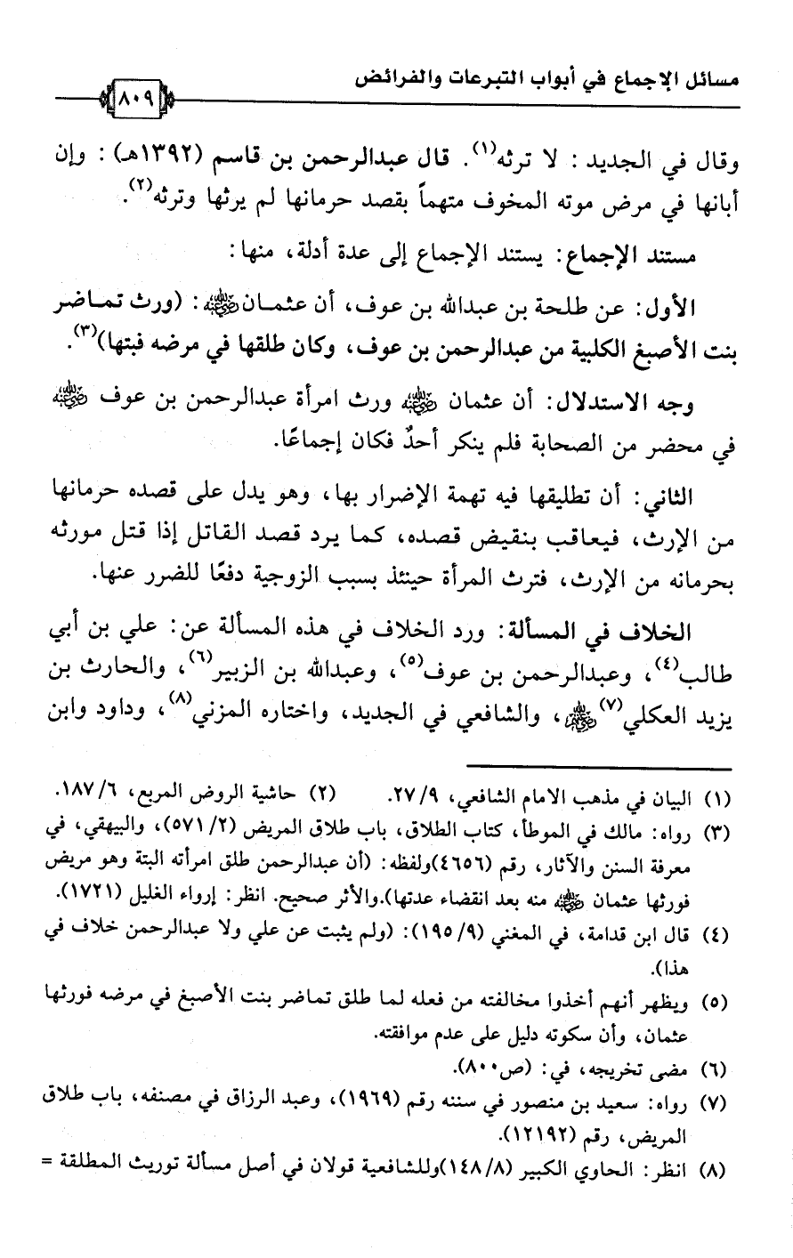(¬5) ويظهر أنهم أخذوا مخالفته من فعله لما طلق تماضر بنت الأصبغ في مرضه فورثها عثمان، وأن سكوته دليل على عدم موافقته.