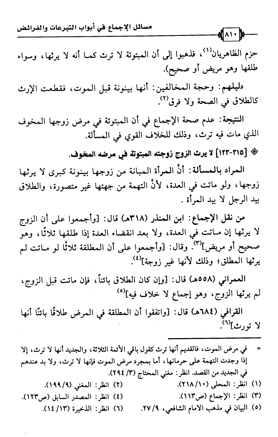 • من نقل الإجماع: ابن المنذر (318 هـ) قال: [وأجمعوا على أن الزوج لا يرثها إن ماتت في العدة، ولا بعد انقضاء العدة إذا طلقها ثلاثًا، وهو صحيح أو مريض] (¬3). وقال: [وأجمعوا على أن المطلقة ثلاثًا لو ماتت لم يرثها المطلق؛ وذلك لأنها غير زوجة] (¬4).