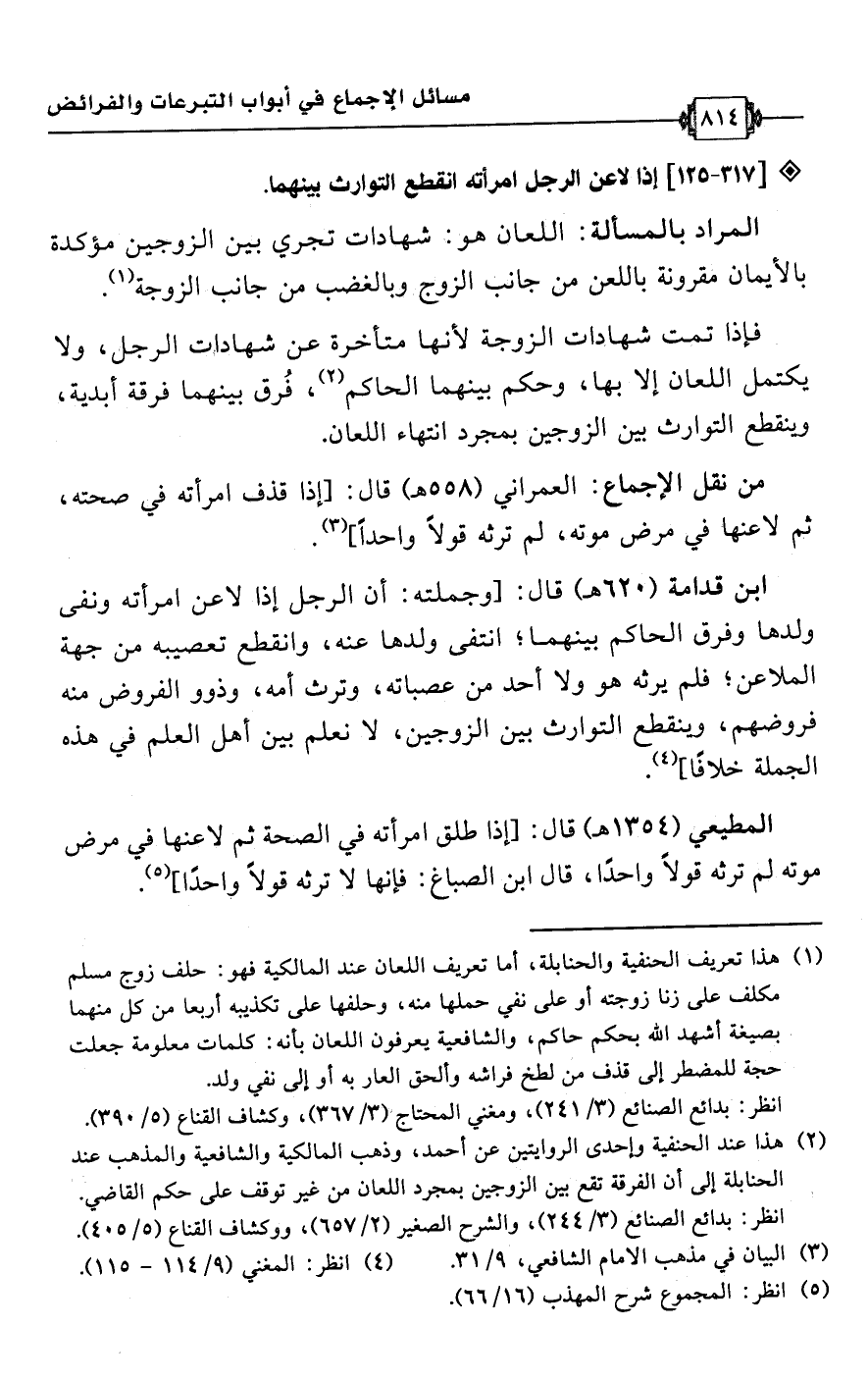 • من نقل الإجماع: العمراني (558 هـ) قال: [إذا قذف امرأته في صحته، ثم لاعنها في مرض موته، لم ترثه قولًا واحدًا] (¬3).