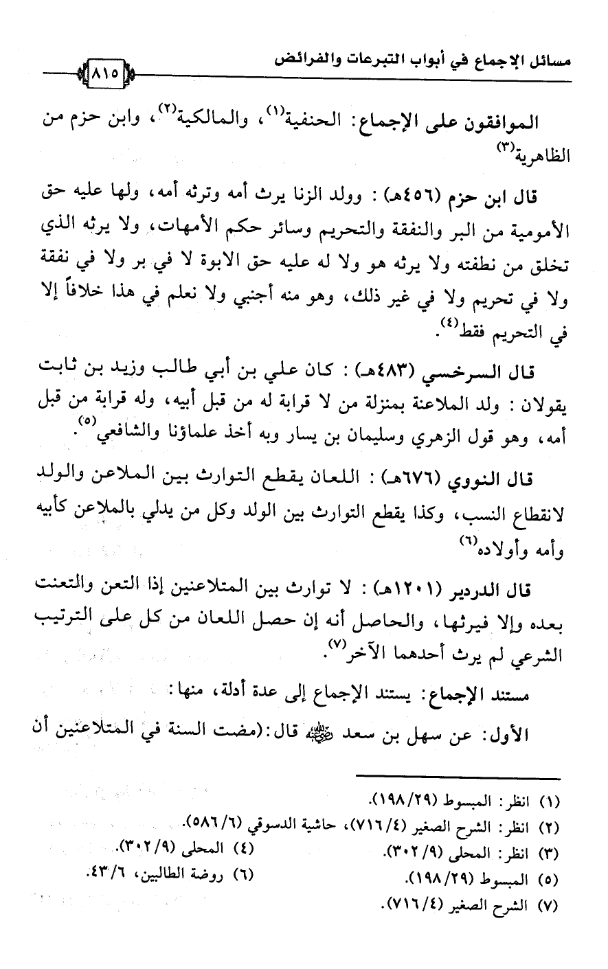 قال السرخسي (483 هـ): كان علي بن أبي طالب وزيد بن ثابت يقولان: ولد الملاعنة بمنزلة من لا قرابة له من قبل أَبيه، وله قرابة من قبل أمه، وهو قول الزهري وسليمان بن يسار وبه أخذ علماؤنا والشافعي (¬5).