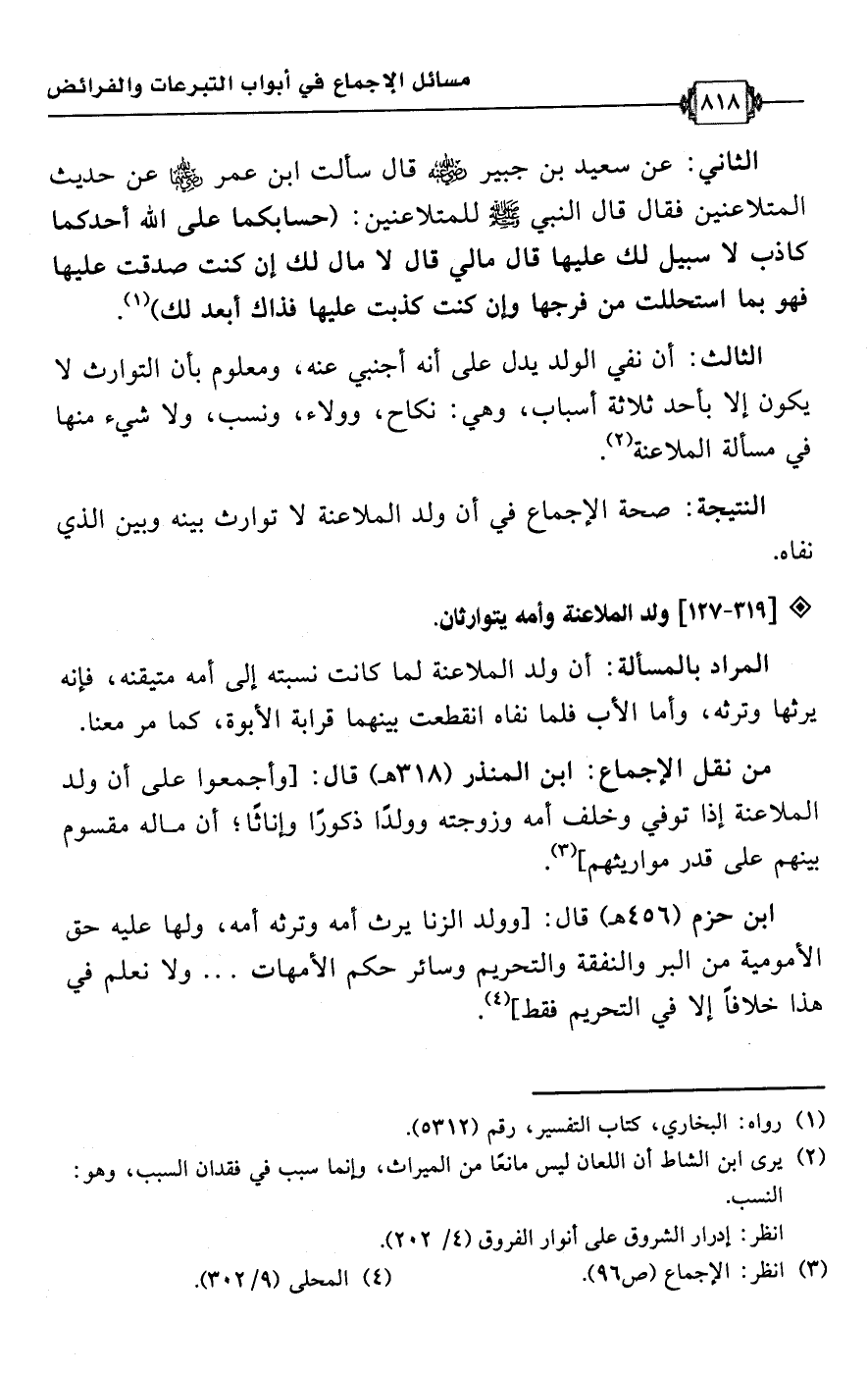 • من نقل الإجماع: ابن المنذر (318 هـ) قال: [وأجمعوا على أن ولد الملاعنة إذا توفي وخلف أمه وزوجته وولدًا ذكورًا وإناثًا؛ أن ماله مقسوم بينهم على قدر مواريثهم] (¬3).