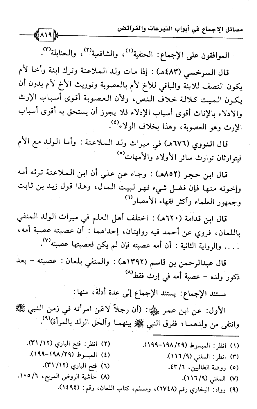 قال ابن حجر (852 هـ): وجاء عن علي أن ابن الملاعنة ترثه أمه وإخوته منها فإن فضل شيء فهو لبيت المال، وهذا قول زيد بن ثابت وجمهور العلماء وأكثر فقهاء الأمصار (¬6).