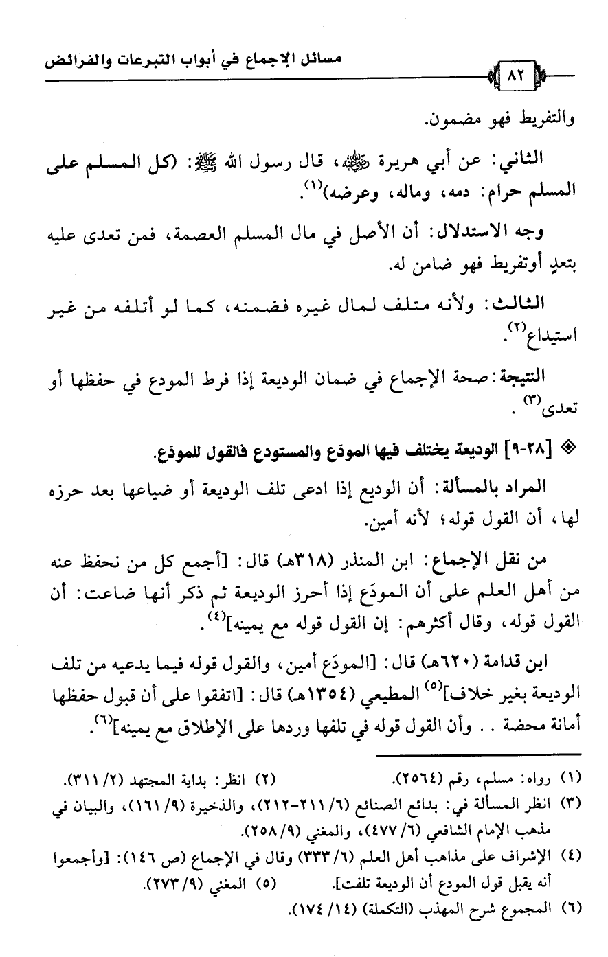 ابن قدامة (620 هـ) قال: [المودَع أمين، والقول قوله فيما يدعيه من تلف الوديعة بغير خلاف] (¬5) المطيعي (1354 هـ) قال: [اتفقوا على أن قبول حفظها أمانة محضة. . وأن القول قوله في تلفها وردها على الإطلاق مع يمينه] (¬6).