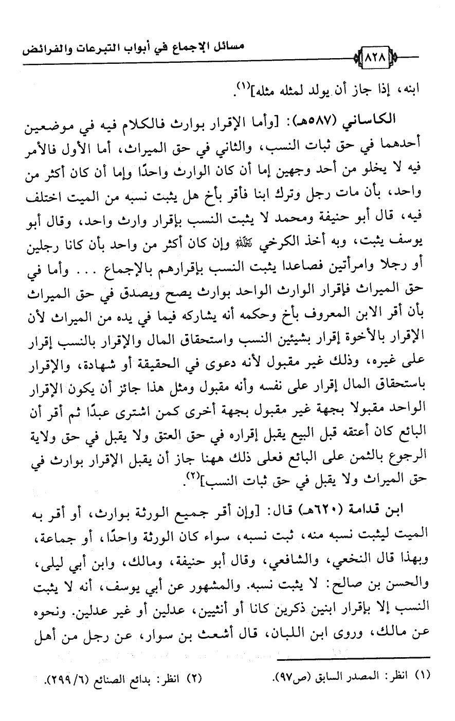 الكاساني (587 هـ): [وأما الإقرار بوارث فالكلام فيه في موضعين أحدهما في حق ثبات النسب، والثاني في حق الميراث، أما الأول فالأمر فيه لا يخلو من أحد وجهين إما أن كان الوارث واحدًا وإما أن كان أكثر من واحد، بأن مات رجل وترك إبنًا فأقر بأخ هل يثبت نسبه من الميت اختلف فيه، قال أبو حنيفة ومحمد لا يثبت النسب بإقرار وارث واحد، وقال أبو يوسف يثبت، وبه أخذ الكرخي رحمه اللَّه وإن كان أكثر من واحد بأن كانا رجلين أو رجلًا وامرأتين فصاعدًا يثبت النسب بإقرارهم بالإجماع. . . وأما في حق الميراث فإقرار الوارث الواحد بوارث يصح ويصدق في حق الميراث بأن أقر الابن المعروف بأخ وحكمه أنه يشاركه فيما في يده من الميراث لأن الإقرار بالأخوة إقرار بشيئين النسب واستحقاق المال والإقرار بالنسب إقرار على غيره، وذلك غير مقبول لأنه دعوى في الحقيقة أو شهادة، والإقرار باستحقاق المال إقرار على نفسه وأنه مقبول ومثل هذا جائز أن يكون الإقرار الواحد مقبولًا بجهة غير مقبول بجهة أخرى كمن اشترى عبدًا ثم أقر أن البائع كان أعتقه قبل البيع يقبل إقراره في حق العتق ولا يقبل في حق ولاية الرجوع بالثمن على البائع فعلى ذلك ها هنا جاز أن يقبل الإقرار بوارث في حق الميراث ولا يقبل في حق ثبات النسب] (¬2).