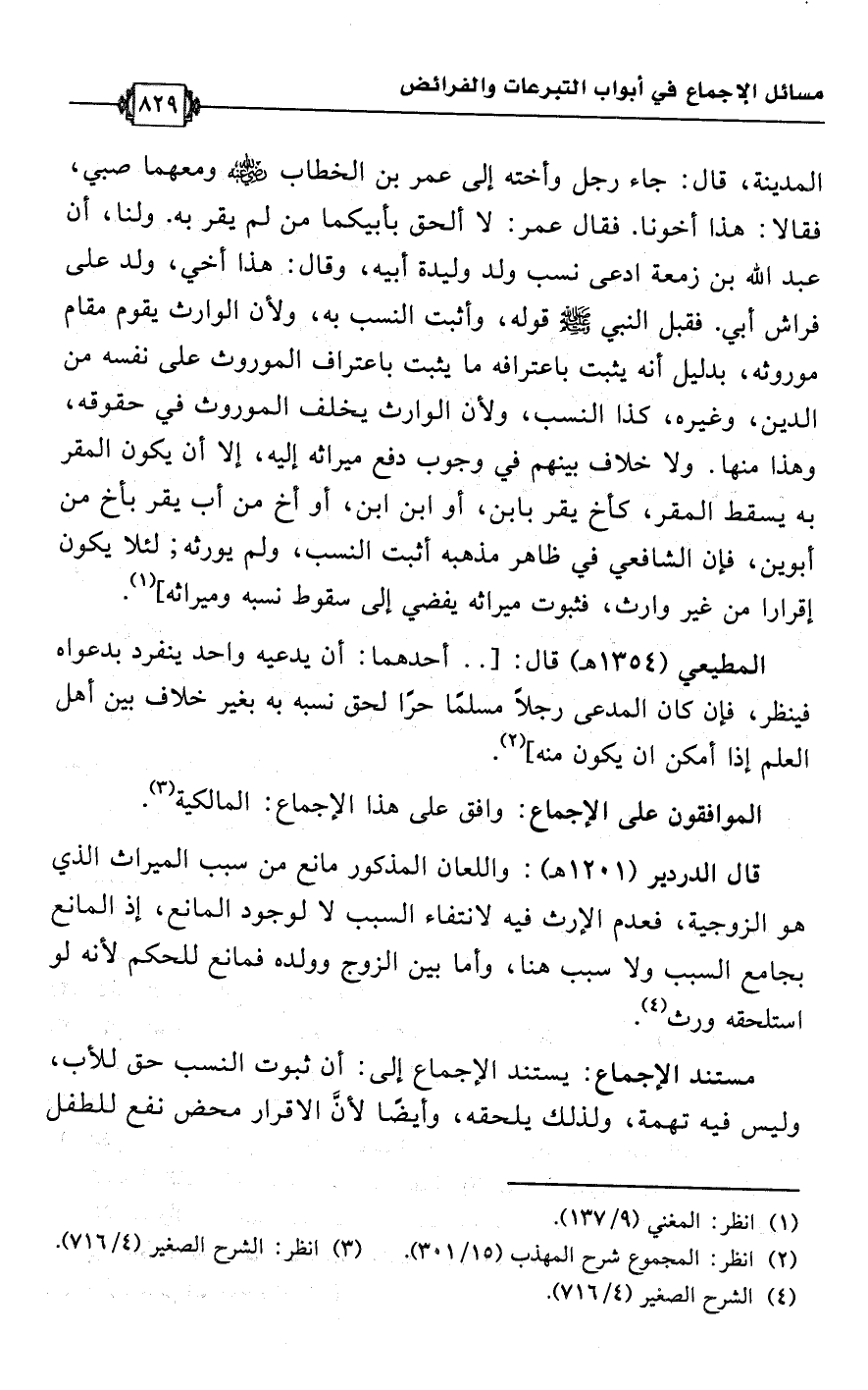 المطيعي (1354 هـ) قال: [. . أحدهما: أن يدعيه واحد ينفرد بدعواه فينظر، فإن كان المدعى رجلًا مسلمًا حرًا لحق نسبه به بغير خلاف بين أهل العلم إذا أمكن ان يكون منه] (¬2).