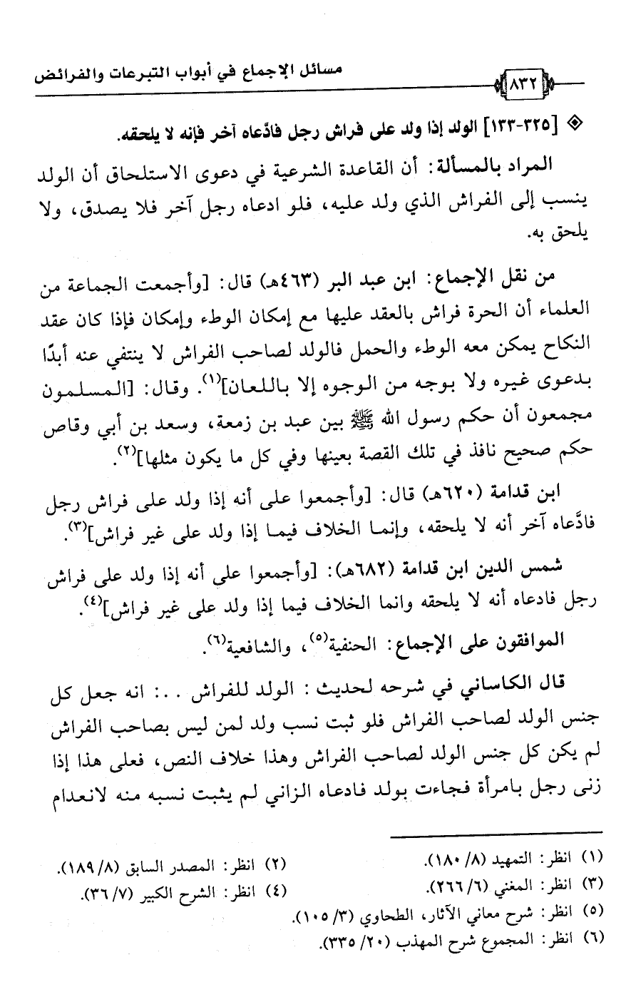شمس الدين ابن قدامة (682 هـ): [وأجمعوا على أنه إذا ولد على فراش رجل فادعاه أنه لا يلحقه وإنما الخلاف فيما إذا ولد على غير فراش] (¬4).