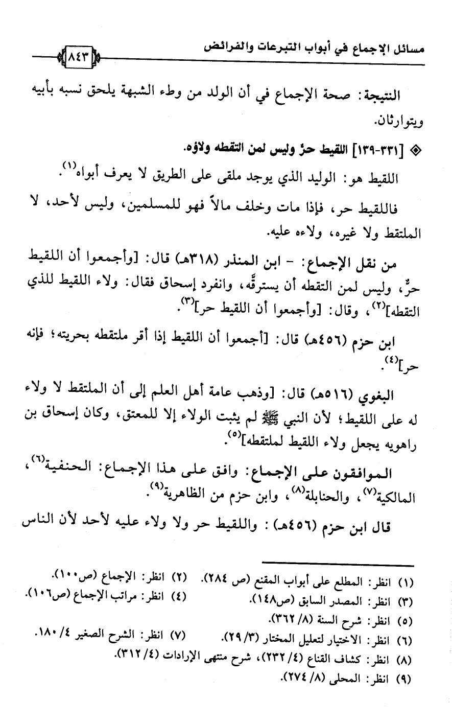 • من نقل الإجماع: ابن المنذر (318 هـ) قال: [وأجمعوا أن اللقيط حرٌّ، وليس لمن التقطه أن يسترقَّه، وانفرد إسحاق فقال: ولاء اللقيط للذي التقطه] (¬2)، وقال: [وأجمعوا أن اللقيط حر] (¬3).
