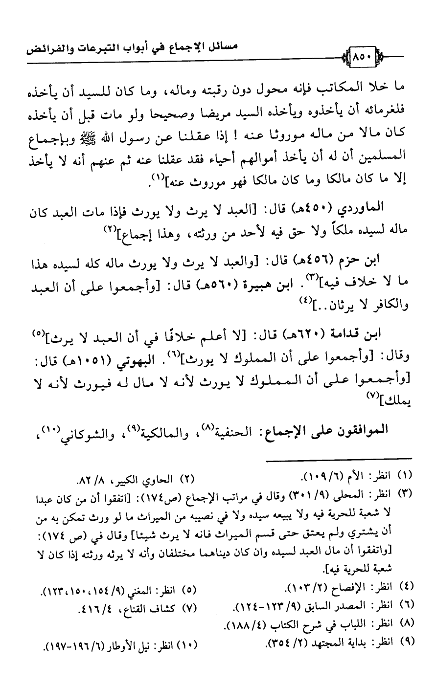 ابن حزم (456 هـ) قال: [والعبد لا يرث ولا يورث ماله كله لسيده هذا ما لا خلاف فيه] (¬3). ابن هبيرة (560 هـ) قال: [وأجمعوا على أن العبد والكافر لا يرثان. .] (¬4).