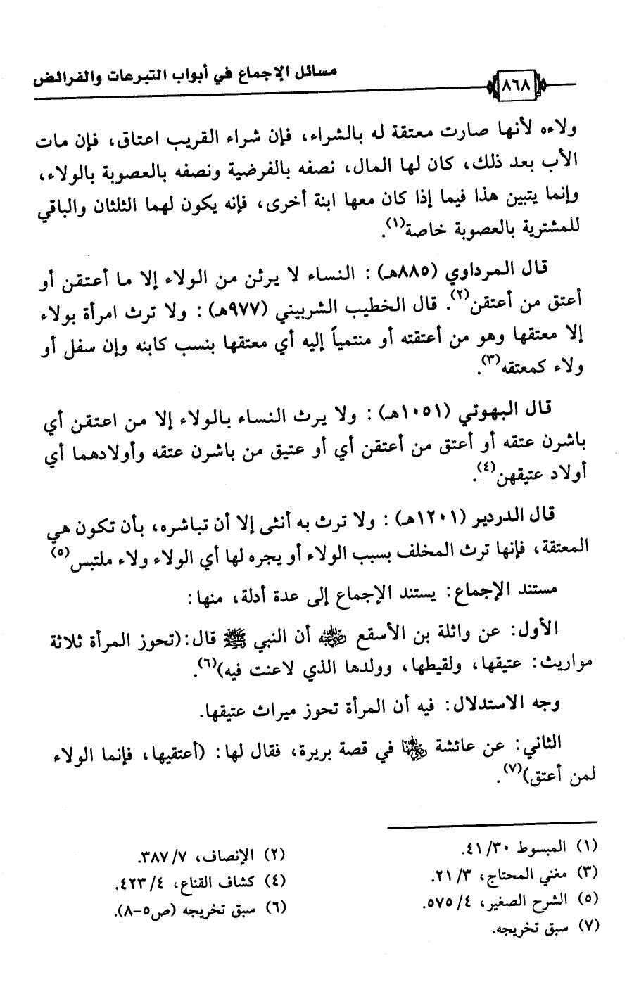 قال المرداوي (885 هـ): النساء لا يرثن من الولاء إلا ما أعتقن أو أعتق من أعتقن (¬2). قال الخطيب الشربيني (977 هـ): ولا ترث امرأة بولاء إلا معتقها وهو من أعتقته أو منتميًا إليه أي معتقها بنسب كابنه وإن سفل أو ولاء كمعتقه (¬3).