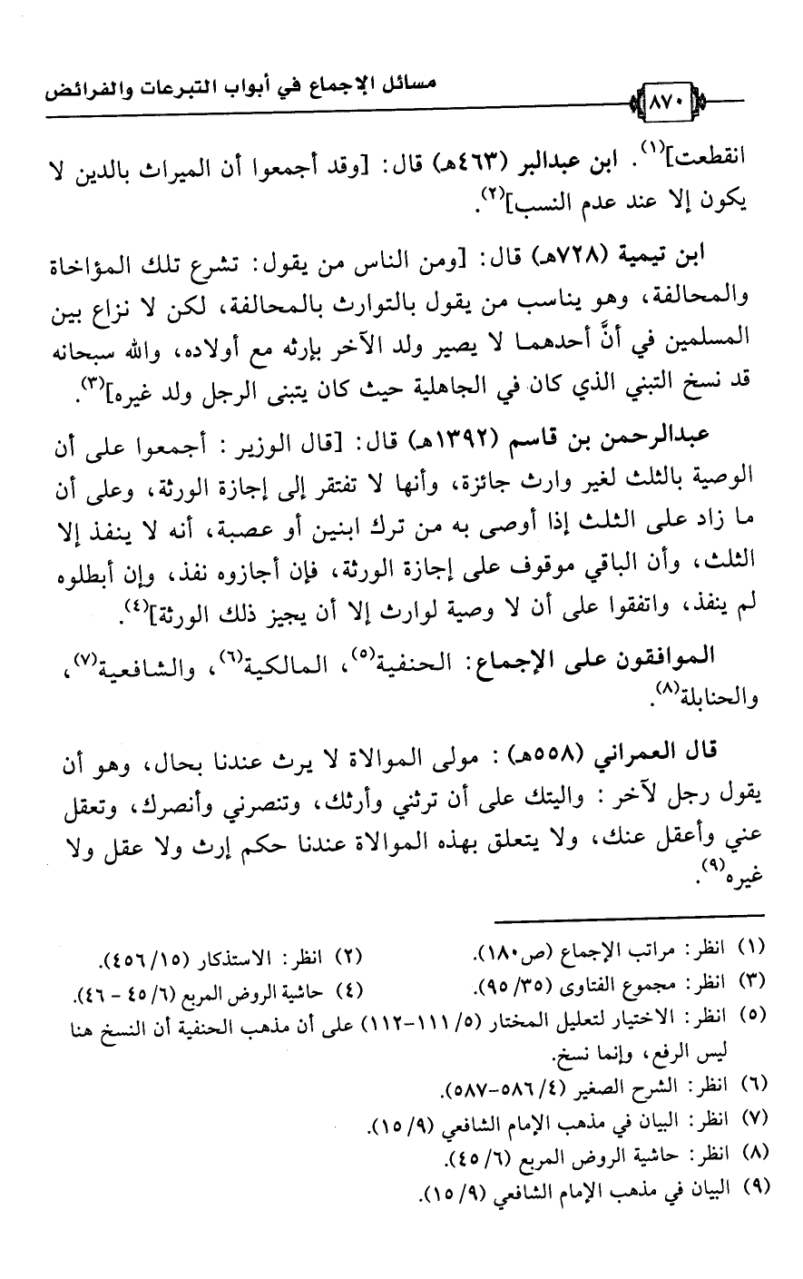 انقطعت] (¬1). ابن عبد البر (463 هـ) قال: [وقد أجمعوا أن الميراث بالدين لا يكون إلا عند عدم النسب] (¬2).