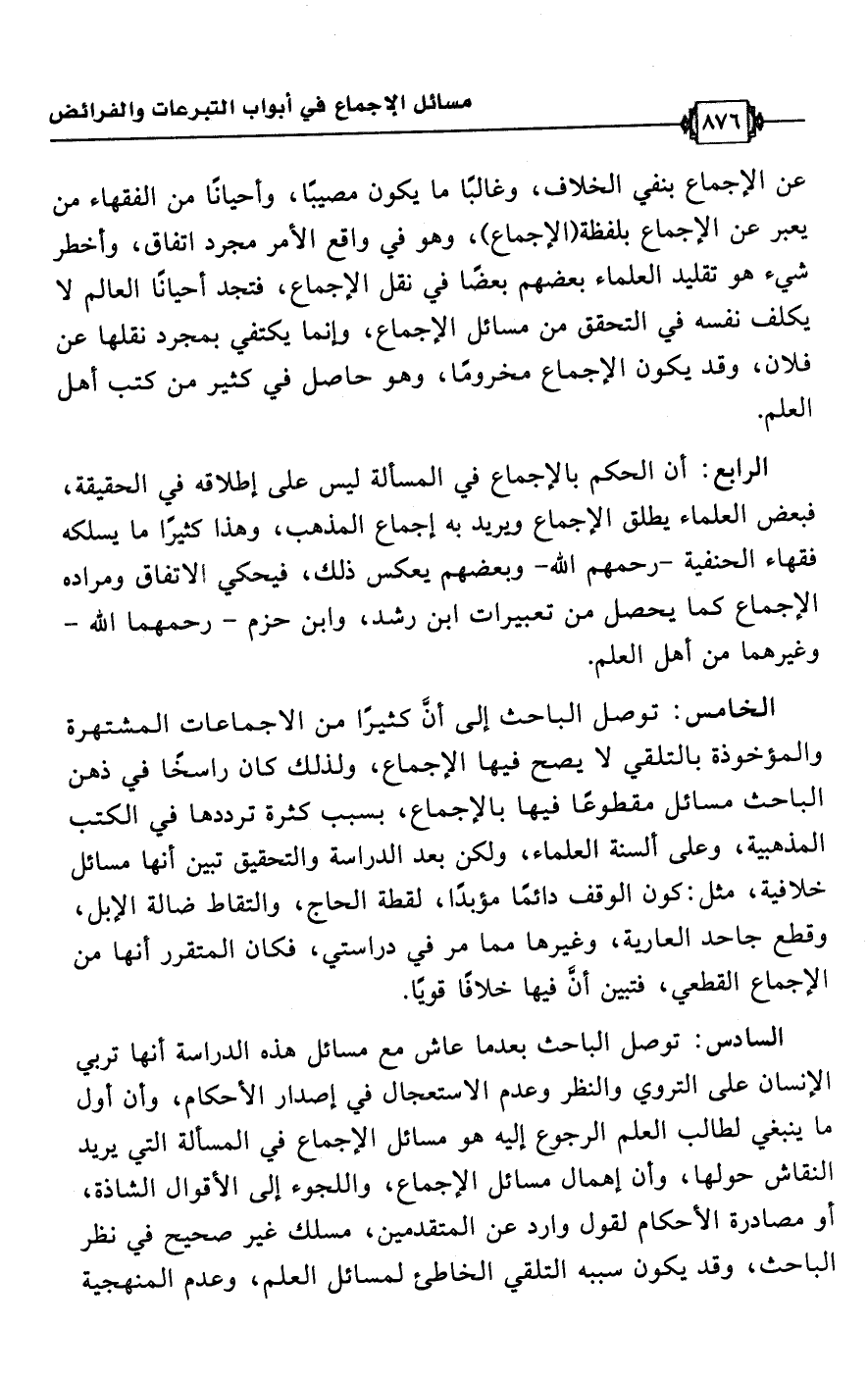 الخامس: توصل الباحث إلى أنَّ كثيرًا من الإجماعات المشتهرة والمؤخوذة بالتلقي لا يصح فيها الإجماع، ولذلك كان راسخًا في ذهن الباحث مسائل مقطوعًا فيها بالإجماع، بسبب كثرة ترددها في الكتب المذهبية، وعلى ألسنة العلماء، ولكن بعد الدراسة والتحقيق تبين أنها مسائل خلافية، مثل: كون الوقف دائمًا مؤبدًا، لقطة الحاج، والتقاط ضالة الإبل، وقطع جاحد العارية، وغيرها مما مر في دراستي، فكان المتقرر أنها من الإجماع القطعي، فتبين أن فيها خلافًا قويًا.