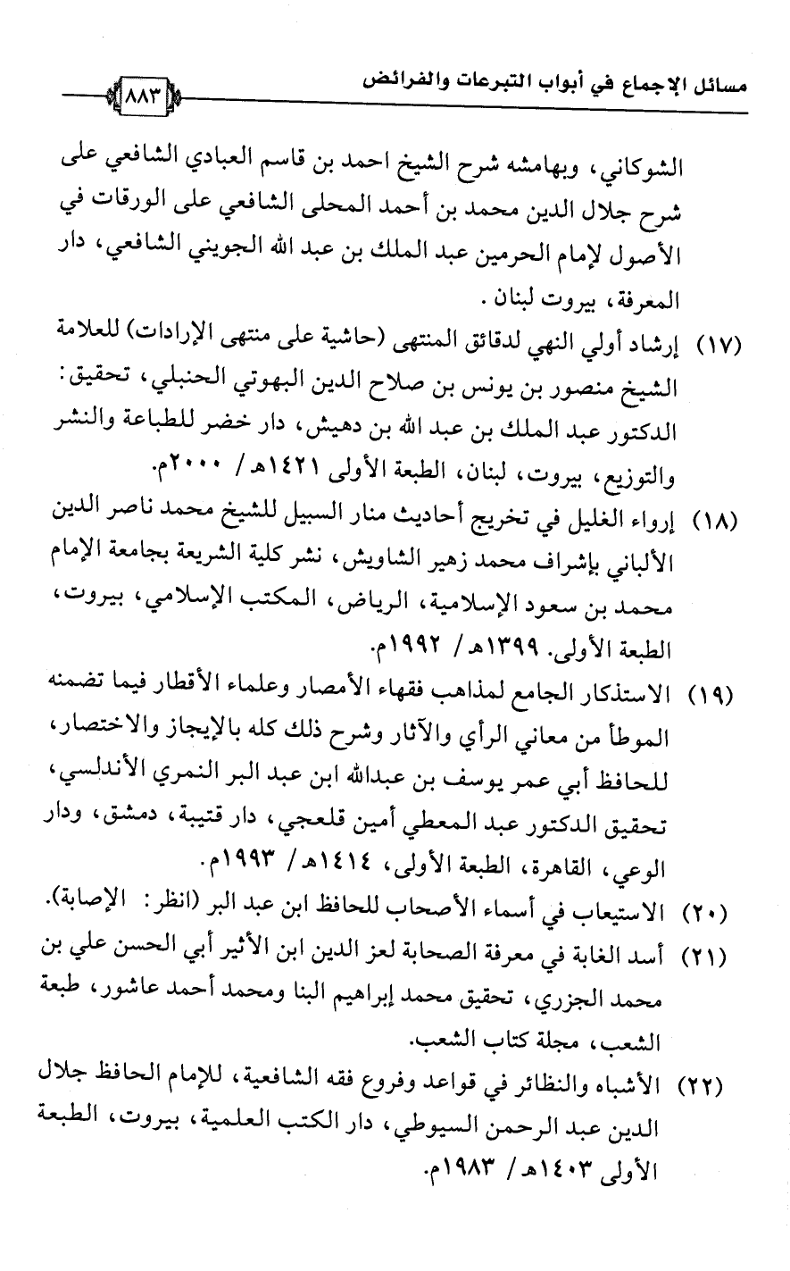 (22) الأشباه والنظائر في قواعد وفروع فقه الشافعية، للإمام الحافظ جلال الدين عبد الرحمن السيوطي، دار الكتب العلمية، بيروت، الطبعة الأولى 1403 هـ/ 1983 م.