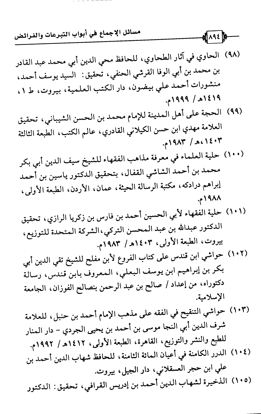 (100) حلية العلماء في معرفة مذاهب الفقهاء للشيخ سيف الدين أبي بكر محمد بن أحمد الشاشي القفال، بتحقيق الدكتور ياسين بن أحمد إبراهم درادكه، مكتبة الرسالة الحيثة، عمان، الأردن، الطبعة الأولى، 1988 م.