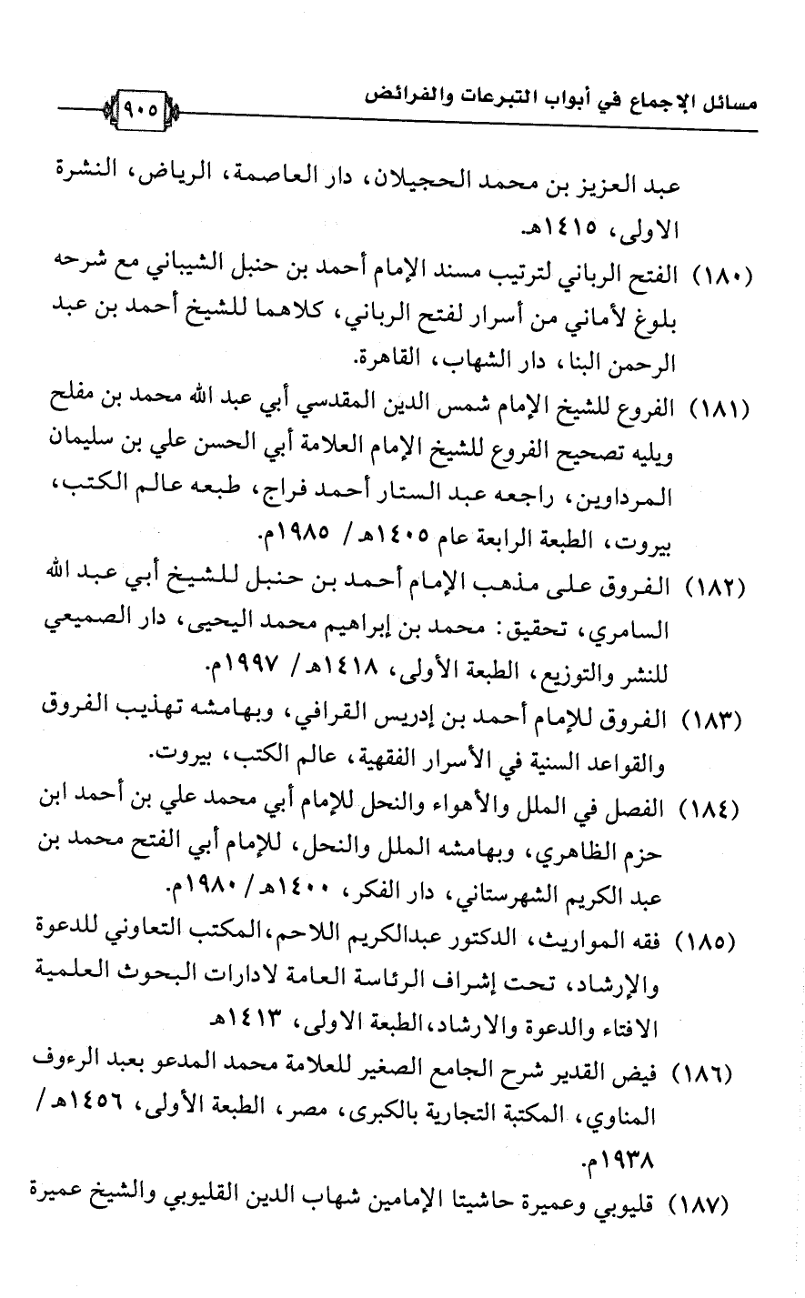 (181) الفروع للشيخ الإمام شمس الدين المقدسي أبي عبد اللَّه محمد بن مفلح ويليه تصحيح الفروع للشيخ الإمام العلامة أبي الحسن علي بن سليمان المرداوين، راجعه عبد الستار أحمد فراج، طبعه عالم الكتب، بيروت، الطبعة الرابعة عام 1405 هـ/ 1985 م.
