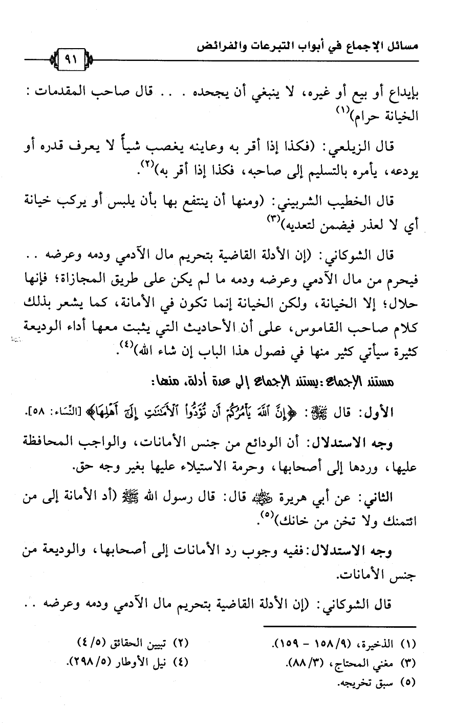قال الشوكاني: (إن الأدلة القاضية بتحريم مال الآدمي ودمه وعرضه. . فيحرم من مال الآدمي وعرضه ودمه ما لم يكن على طريق المجازاة؛ فإنها حلال؛ إلا الخيانة، ولكن الخيانة إنما تكون في الأمانة، كما يشعر بذلك كلام صاحب القاموس، على أن الأحاديث التي يثبت معها أداء الوديعة كثيرة سيأتي كثير منها في فصول هذا الباب إن شاء اللَّه) (¬4).