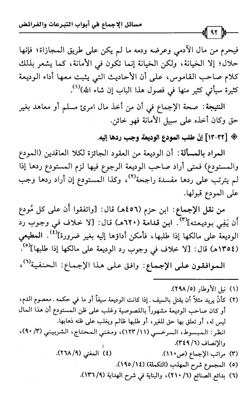 • من نقل الإجماع: ابن حزم (456 هـ) قال: [واتفقوا أَن على كل مُودع أَن يَفِي بوديعته] (¬3). ابن قدامة (620 هـ) قال: [لا خلاف في وجوب رد الوديعة على مالكها إذا طلبها، فأمكن أداؤها إليه بغير ضرورة] (¬4). المطيعي (1354 هـ) قال: [لا خلاف في وجوب رد الوديعة على مالكها إذا طلبها] (¬5).