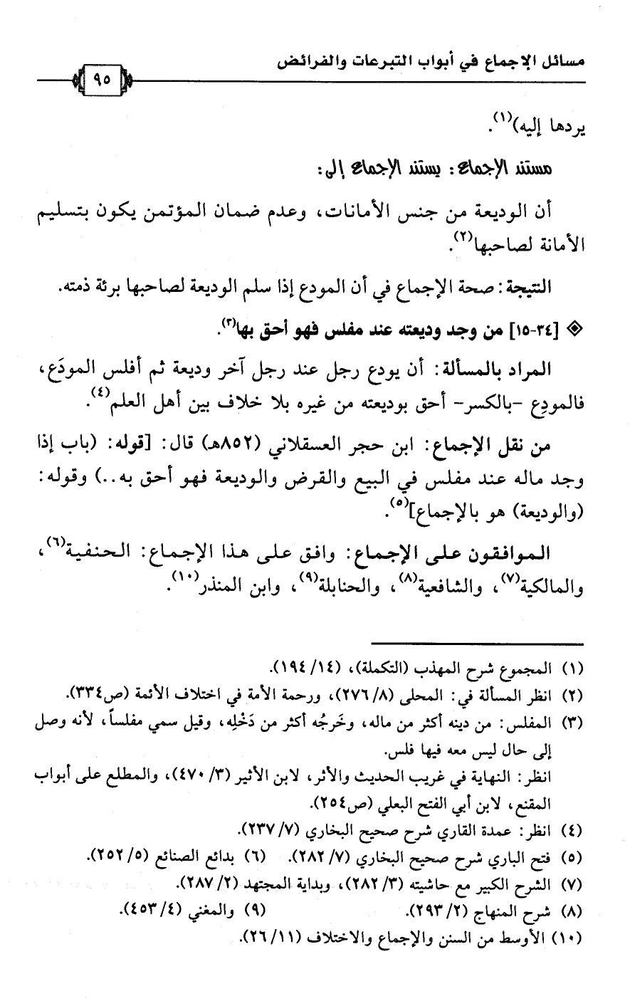 • من نقل الإجماع: ابن حجر العسقلاني (852 هـ) قال: [قوله: (باب إذا وجد ماله عند مفلس في البيع والقرض والوديعة فهو أحق به. .) وقوله: (والوديعة) هو بالإجماع] (¬5).