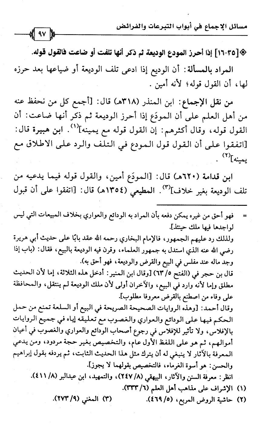 • من نقل الإجماع: ابن المنذر (318 هـ) قال: [أجمع كل من نحفظ عنه من أهل العلم على أن المودَع إذا أحرز الوديعة ثم ذكر أنها ضاعت: أن القول قوله، وقال أكثرهم: إن القول قوله مع يمينه] (¬1). ابن هبيرة قال: [اتفقوا على أن القول قول المودع في التلف والرد على الاطلاق مع يمينه] (¬2).