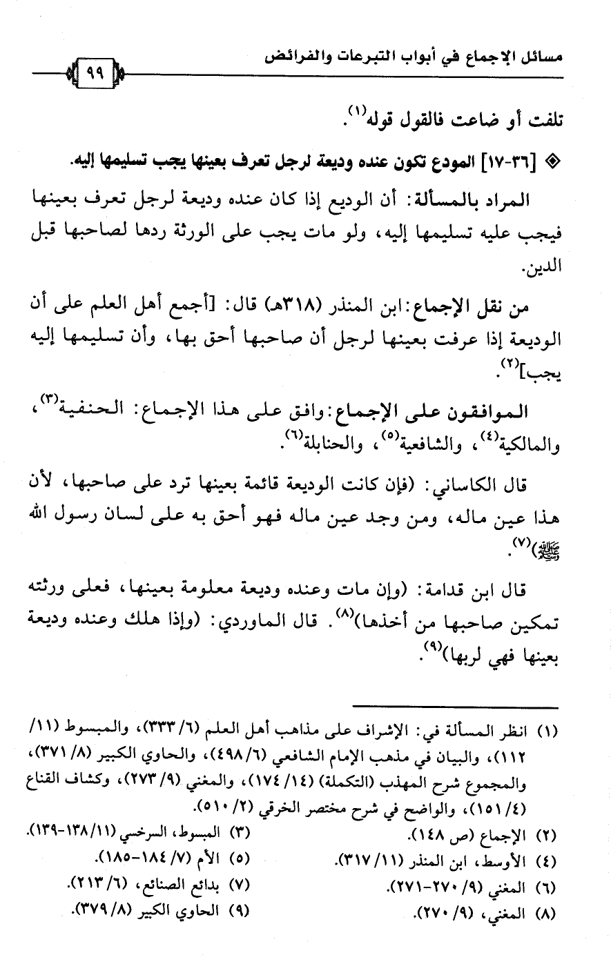 • من نقل الإجماع: ابن المنذر (318 هـ) قال: [أجمع أهل العلم على أن الوديعة إذا عرفت بعينها لرجل أن صاحبها أحق بها، وأن تسليمها إليه يجب] (¬2).