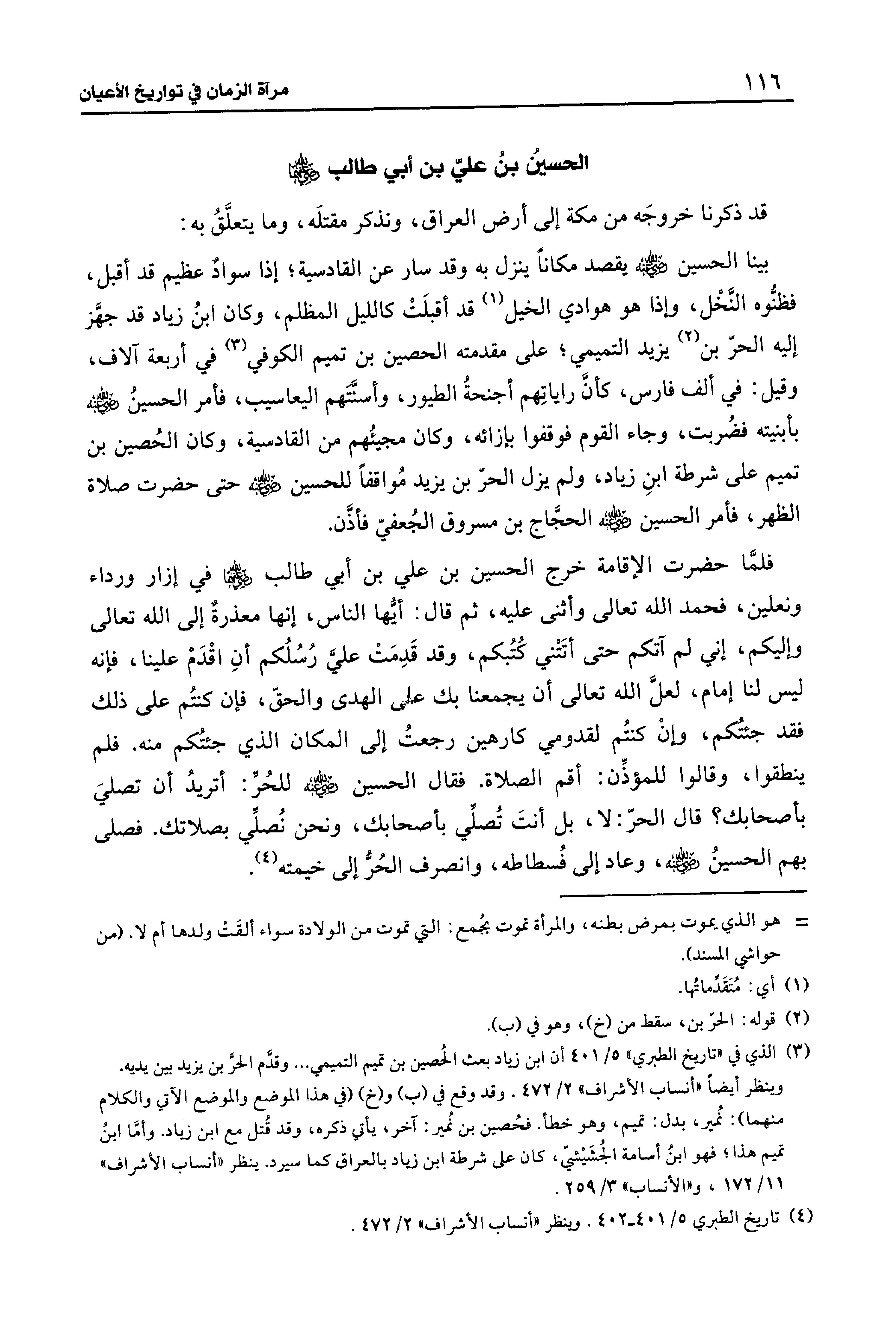 قد ذكرنا خروجَه من مكة إلى أرض العراق، ونذكر مقتلَه، وما يتعلَّقُ به: بينا الحسين - رضي الله عنه - يقصد مكانًا ينزل به وقد سار عن القادسية؛ إذا سوادٌ عظيم قد أقبل، فظنُّوه النَّخْل، وإذا هو هوادي الخيل (¬1) قد أقبلَتْ كالليل المظلم، وكان ابنُ زياد قد جهَّز إليه الحرّ بن (¬2) يزيد التميمي؛ على مقدمته الحصين بن تميم الكوفي (¬3) في أربعة آلاف، وقيل: في ألف فارس، كأنَّ راياتِهم أجنحةُ الطيور، وأسنَّتَهم اليعاسيب، فأمر الحسينُ - رضي الله عنه - بأبنيته فضُربت، وجاء القوم فوقفوا بإزائه، وكان مجيئُهم من القادسية، وكان الحُصين بن تميم على شرطة ابنِ زياد، ولم يزل الحرّ بن يزيد مُواقفًا للحسين - رضي الله عنه - حتى حضرت صلاة الظهر، فأمر الحسين - رضي الله عنه - الحجَّاج بن مسروق الجُعفيّ فأذَّن.