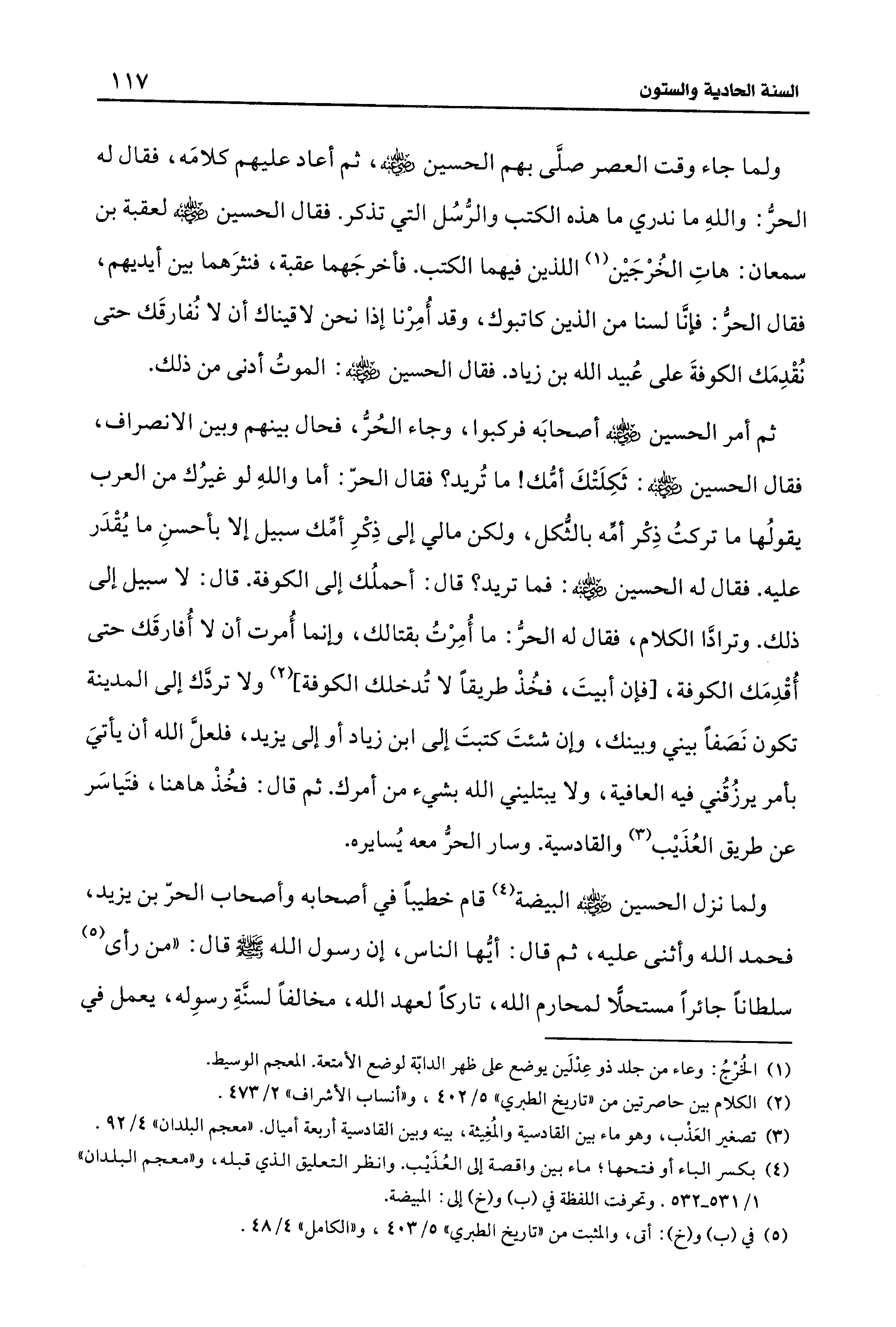 ثم أمر الحسين - رضي الله عنه - أصحابَه فركبوا، وجاء الحُرُّ، فحال بينهم وبين الانصراف، فقال الحسين - رضي الله عنه -: ثَكِلَتْكَ أمّك! ما تُريد؟ فقال الحرّ: أما واللهِ لو غيرُك من العرب يقولُها ما تركتُ ذِكْر أمِّه بالثُّكل، ولكن مالي إلى ذِكْرِ أمِّك سبيل إلا بأحسنِ ما يُقْدَر عليه. فقال له الحسين - رضي الله عنه -: فما تريد؟ قال. أحملُك إلى الكوفة. قال: لا سبيل إلى ذلك. وترادَّا الكلام، فقال له الحرُّ: ما أُمِرْتُ بقتالك، وإنما أُمرت أن لا أُفارقَك حتى أُقْدِمَك الكوفة، [فإن أبيتَ، فخُذْ طريقًا لا تُدخلك الكوفة] (¬2) ولا تردَّك إلى المدينة تكون نَصَفًا بيني وبينك، وإن شئتَ كتبتَ إلى ابن زياد أو إلى يزيد، فلعلَّ الله أن يأتيَ بأمر يرزُقُني فيه العافية، ولا يبتليني الله بشيء من أمرك. ثم قال: فخُذْ هاهنا، فتَياسَر عن طريق العُذَيب (¬3) والقادسية. وسار الحرُّ معه يُسايره.