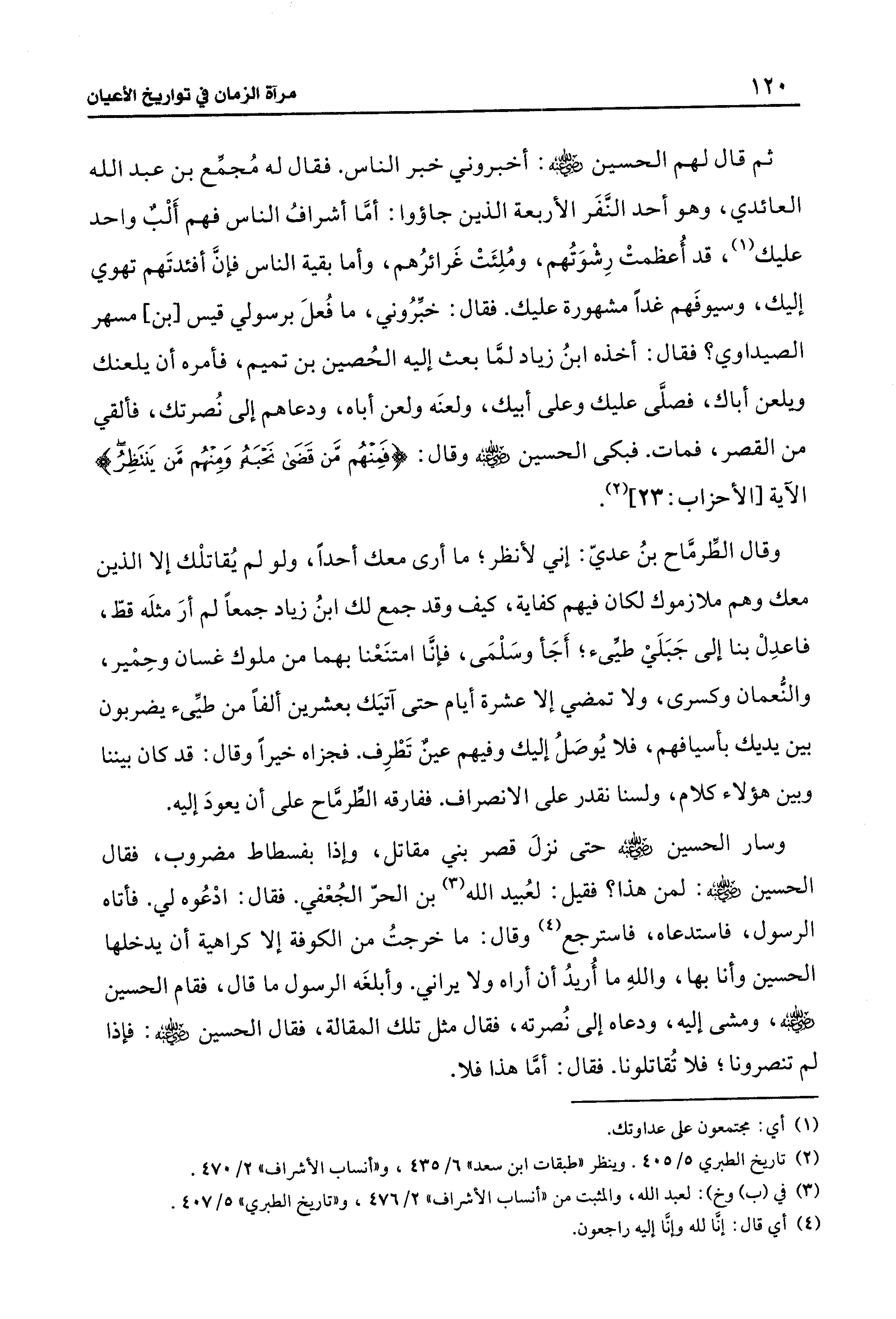 وقال الطِّرمَّاح بنُ عديّ: إني لأنظر؛ ما أرى معك أحدًا، ولو لم يُقاتلْك إلا الذين معك وهم ملازموك لكان فيهم كفاية، كيف وقد جمع لك ابنُ زياد جمعًا لم أرَ مثلَه قطّ، فاعدِلْ بنا إلى جَبَلَي طيِّئ؛ أَجَأ وسَلْمَى، فإنَّا امتنَعْنا بهما من ملوك غسان وحِمْير، والنُّعمان وكسرى، ولا تمضي إلا عشرة أيام حتى آتيَك بعشرين ألفًا من طيِّئ يضربون بين يديك بأسيافهم، فلا يُوصَلُ إليك وفيهم عينٌ تَطْرِف. فجزاه خيرًا وقال: قد كان بيننا وبين هؤلاء كلام، ولسنا نقدر على الانصراف. ففارقه الطِّرمَّاح على أن يعودَ إليه.