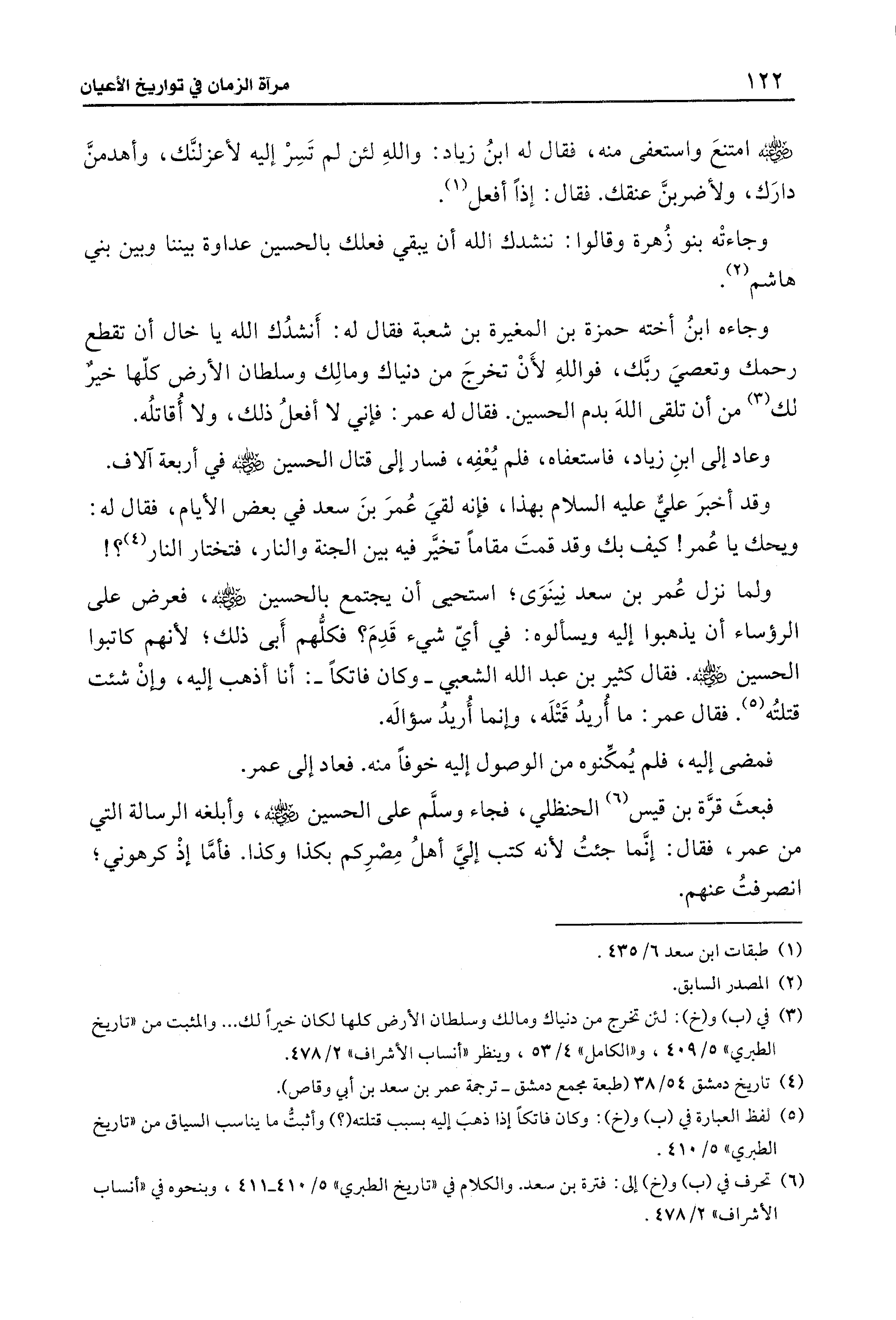 وعاد إلى ابنِ زياد، فاستعفاه، فلم يُعْفِه، فسار إلى قتال الحسين - رضي الله عنه - في أربعة آلاف.