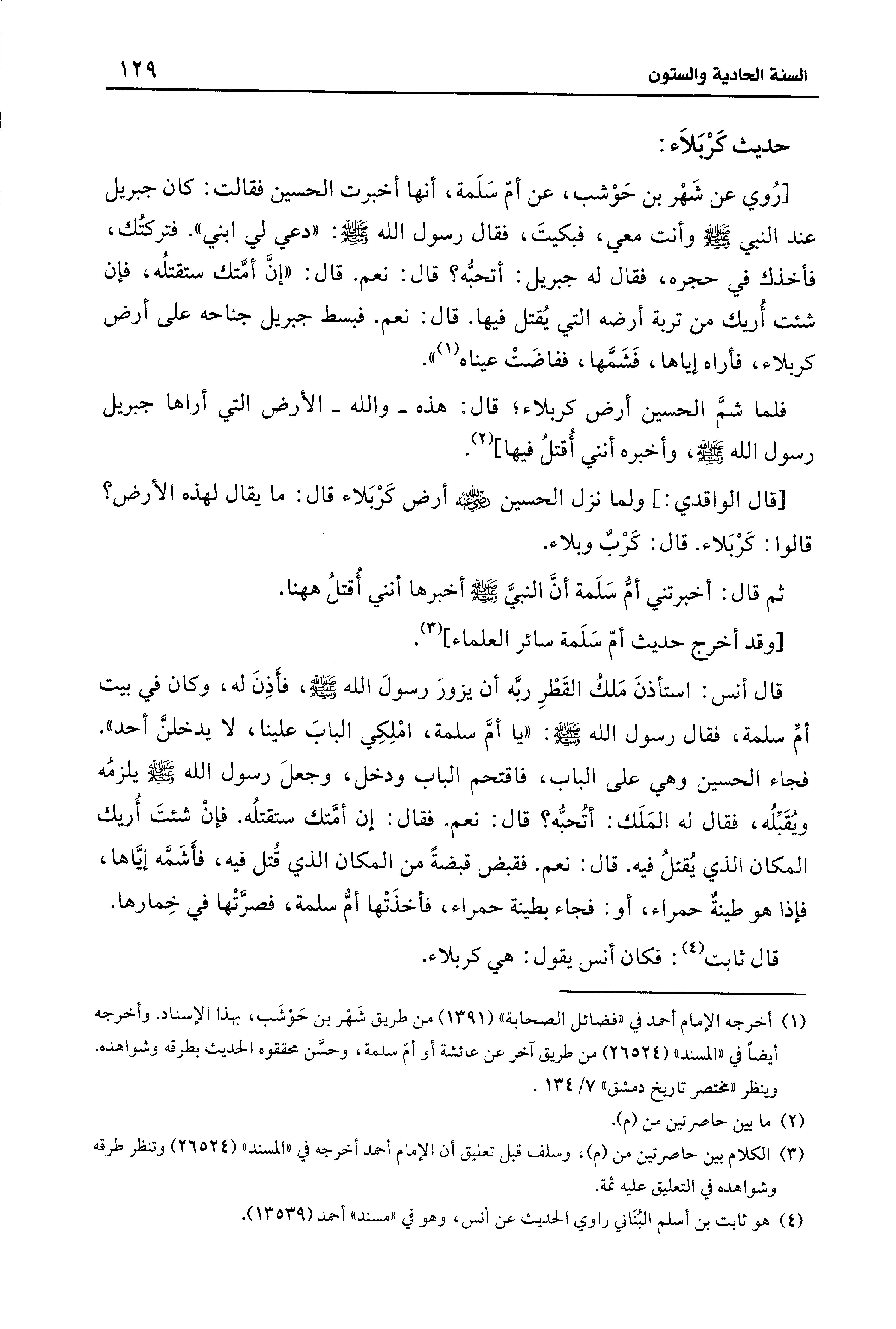 [رُوي عن شَهْر بن حَوْشب، عن أمّ سَلَمة، أنها أخبرت الحسين فقالت: كان جبريل عند النبي - صلى الله عليه وسلم - وأنت معي، فبكيتَ، فقال رسول الله - صلى الله عليه وسلم -: "دعي لي ابني". فتركتُك، فأخذك في حجره، فقال له جبريل: أتحبُّه؟ قال: نعم. قال: "إنَّ أمَّتك ستقتلُه، فإن شئت أُريك من تربة أرضه التي يُقتل فيها. قال: نعم. فبسط جبريل جناحه على أرض كربلاء، فأراه إياها، فَشَمَّها، ففاضَتْ عيناه (¬1) ".