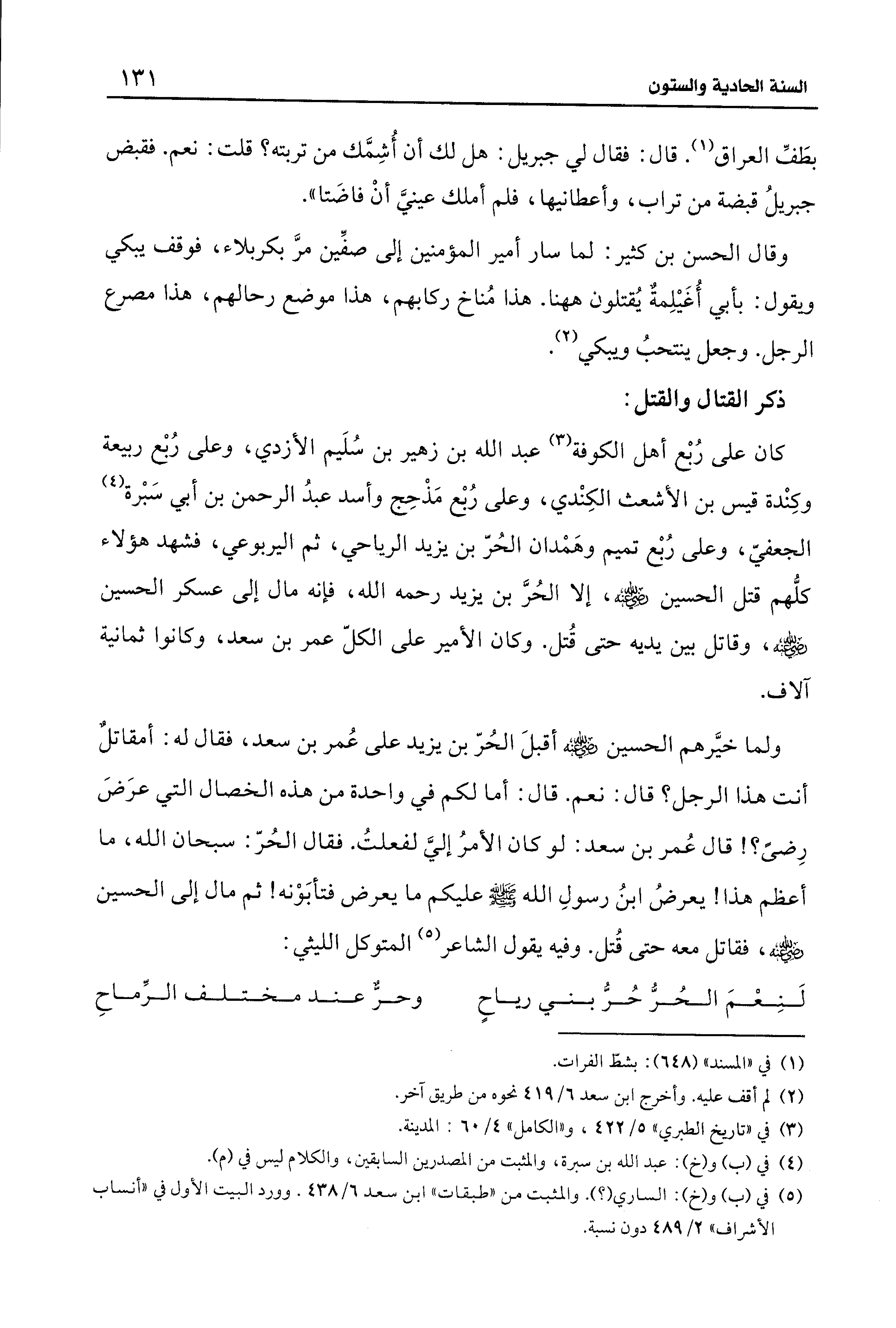 ولما خيَّرهم الحسين - رضي الله عنه - أقبلَ الحُرّ بن يزيد على عُمر بن سعد، فقال له: أمقاتلٌ أنت هذا الرجل؟ قال: نعم. قال: أما لكم في واحدة من هذه الخصال التي عرَضَ رِضىً؟ ! قال عُمر بن سعد: لو كان الأمرُ إليَّ لفعلتُ. فقال الحُرّ: سبحان الله، ما أعظم هذا! يعرضُ ابنُ رسولِ الله - صلى الله عليه وسلم - عليكم ما يعرض فتأبَوْنه! ثم مال إلى الحسين - رضي الله عنه -، فقاتل معه حتى قُتل. وفيه يقول الشاعر (¬5) المتوكل الليثي: