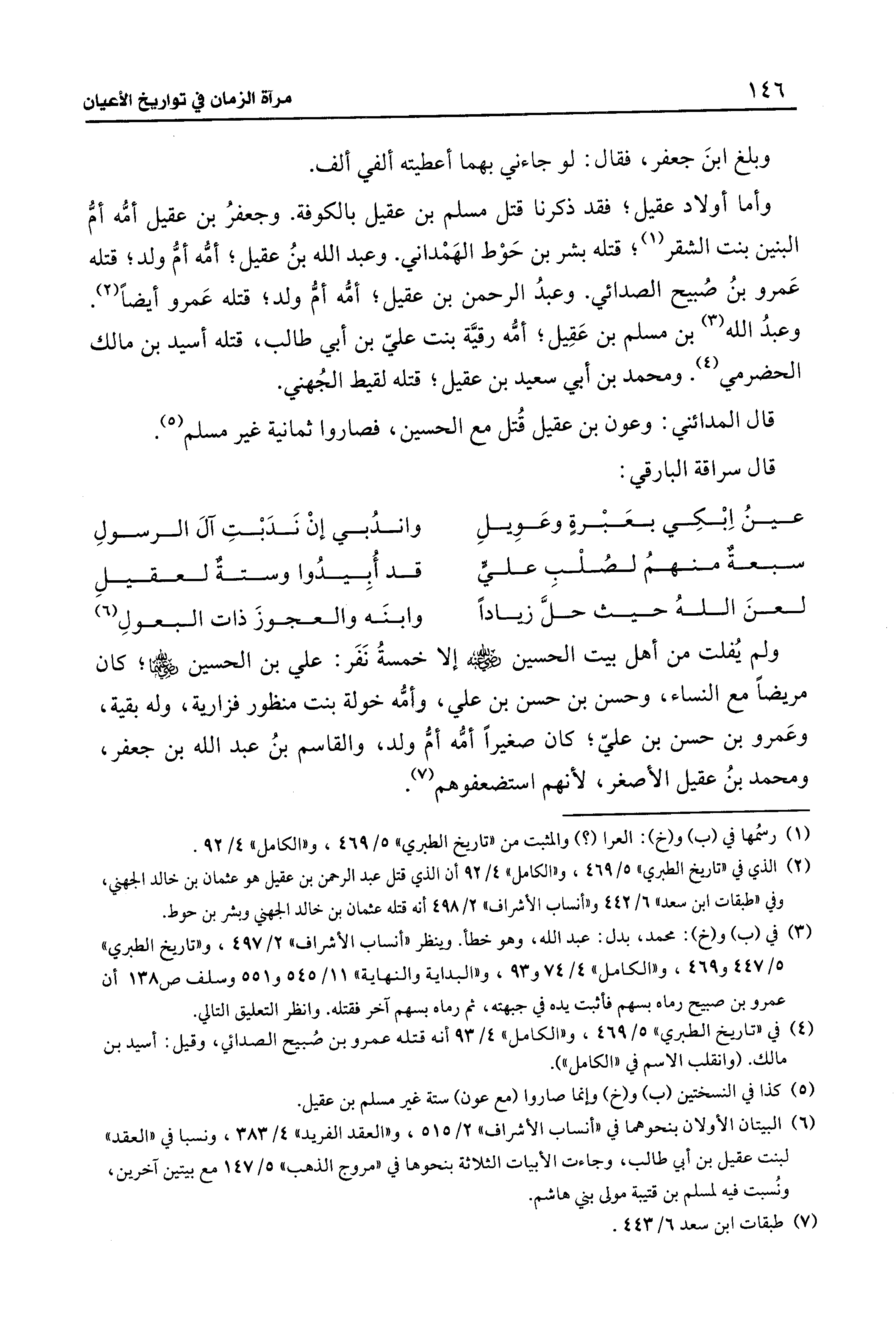(¬6) البيتان الأولان بنحوهما في "أنساب الأشراف" 2/ 515، و"العقد الفريد" 4/ 383، ونسبا في "العقد" لبنت عقيل بن أبي طالب، وجاءت الأبيات الثلاثة بنحوها في "مروج الذهب" 5/ 147 مع بيتين آخرين، ونُسبت فيه لمسلم بن قتيبة مولى بني هاشم.