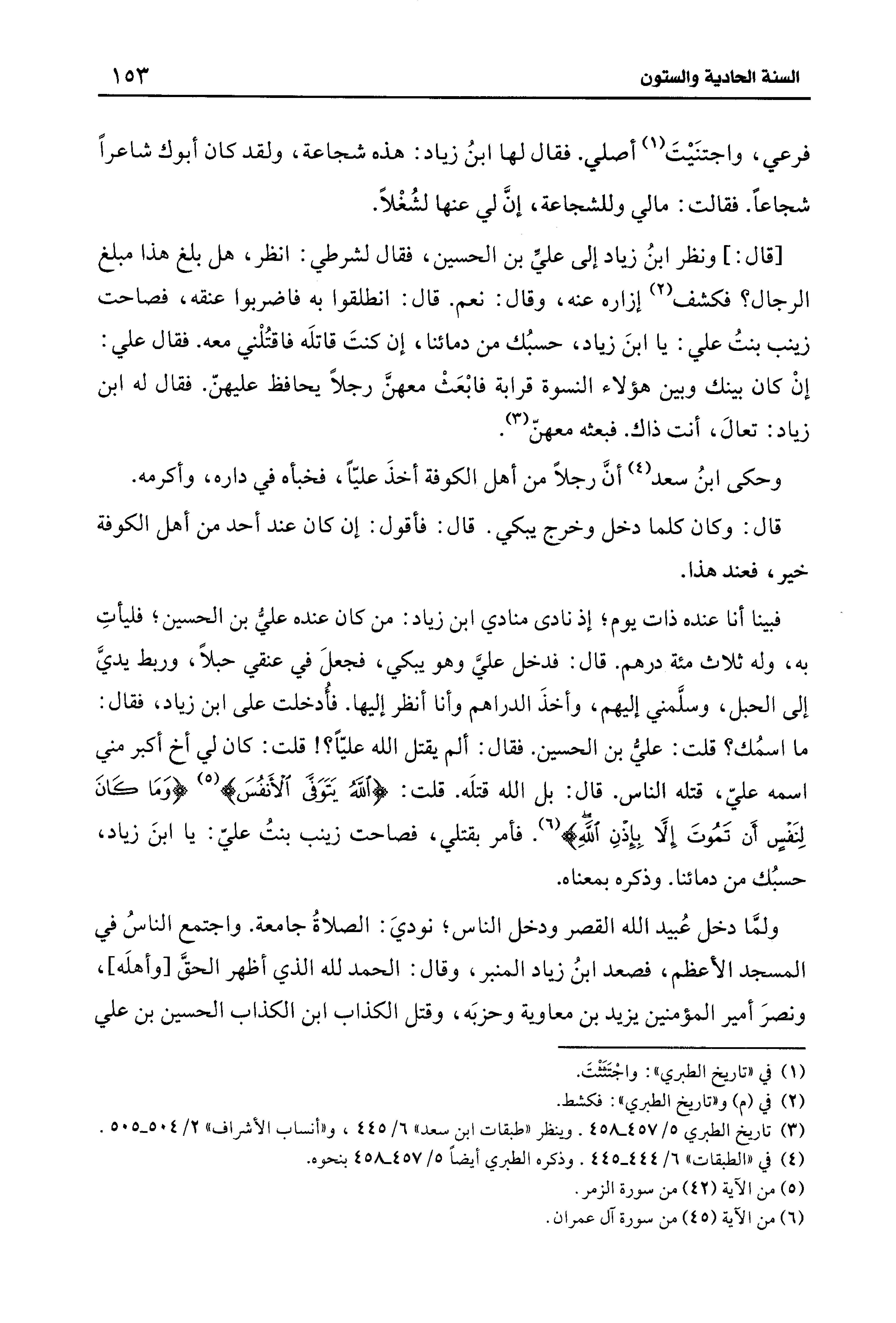 فبينا أنا عنده ذات يوم؛ إذ نادى منادي ابن زياد: من كان عنده عليّ بن الحسين؛ فليأتِ به، وله ثلاث مئة درهم. قال: فدخل عليَّ وهو يبكي، فجعلَ في عنقي حبلًا، وربط يديَّ إلى الحبل، وسلَّمني إليهم، وأخذَ الدراهم وأنا انظر إليها. فأُدخلت على ابن زياد، فقال: ما اسمُك؟ قلت: عليُّ بن الحسين. فقال: ألم يقتل الله عليًّا؟ ! قلت: كان في أخ أكبر مني اسمه عليّ، قتله الناس. قال: بل الله قتلَه. قلت: {اللَّهُ يَتَوَفَّى الأنْفُسَ} (¬5) {وَمَا كانَ لِنَفسٍ أَن تَمُوتَ إِلا بِاذنِ اللهِ} (¬6). فأمر بقتلي، فصاحت زبنب بنتُ عليّ: يا ابنَ زياد، حسبُك من دمائنا. وذكر بمعناه.