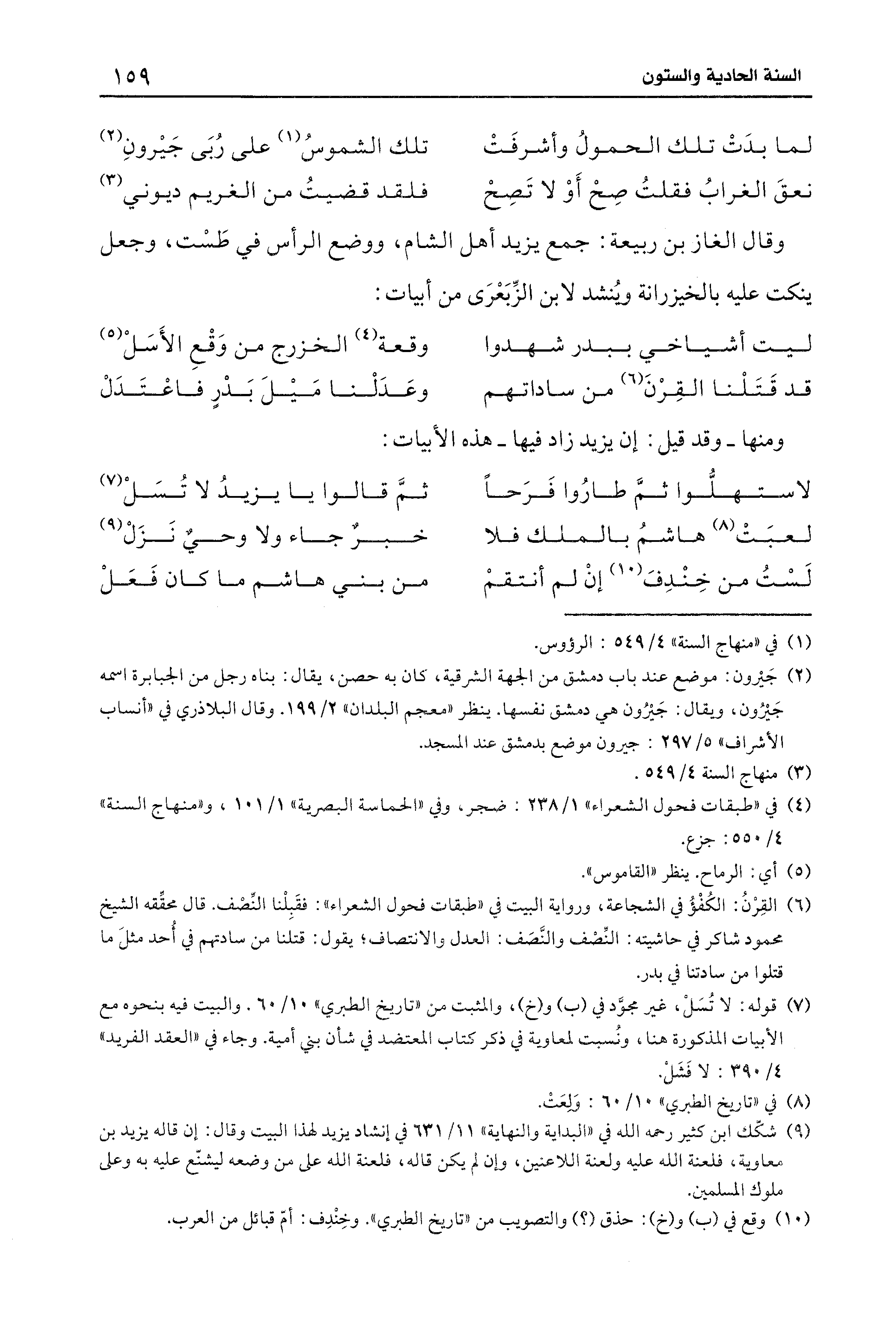 (¬9) شكَّك ابن كثير رحمه الله في "البداية والنهاية" 11/ 631 في إنشاد يزيد لهذا البيت وقال: إن قاله يزيد بن معاوية، فلعنة الله عليه ولعنة اللاعنين، وإن لم يكن قاله، فلعنة الله على عن وضعه ليشنّع عليه به وعلى ملوك المسلمين.