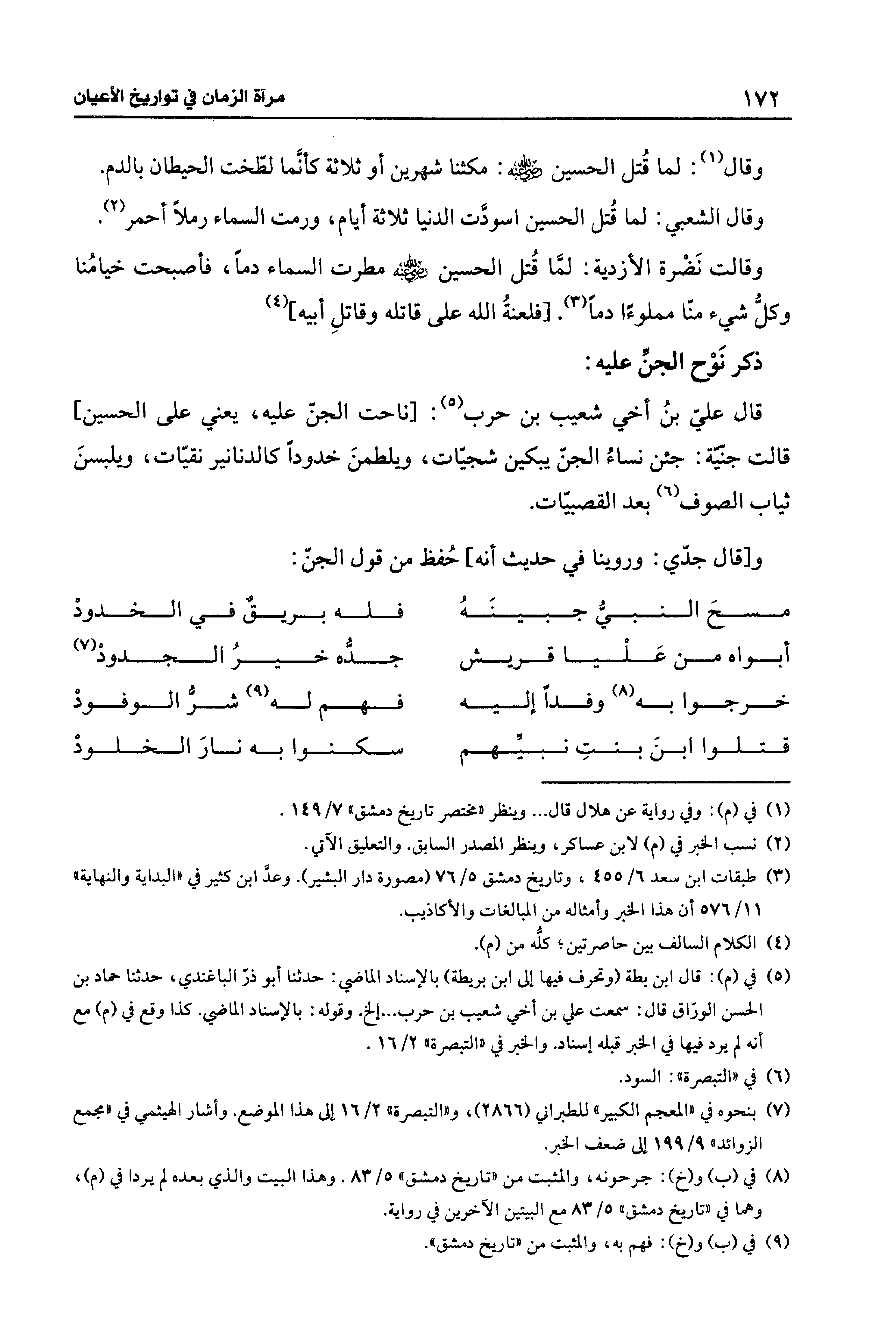 قال علي بنُ أخي شعيب بن حرب (¬5): [ناحت الجن عليه، يعني على الحسين] قالت جنية: جئن نساءُ الجنّ يبكين شجيّات، ويلطمنَ خدودًا كالدنانير نقيّات، ويلبسنَ ثياب الصوف (¬6) بعد القصبيات.