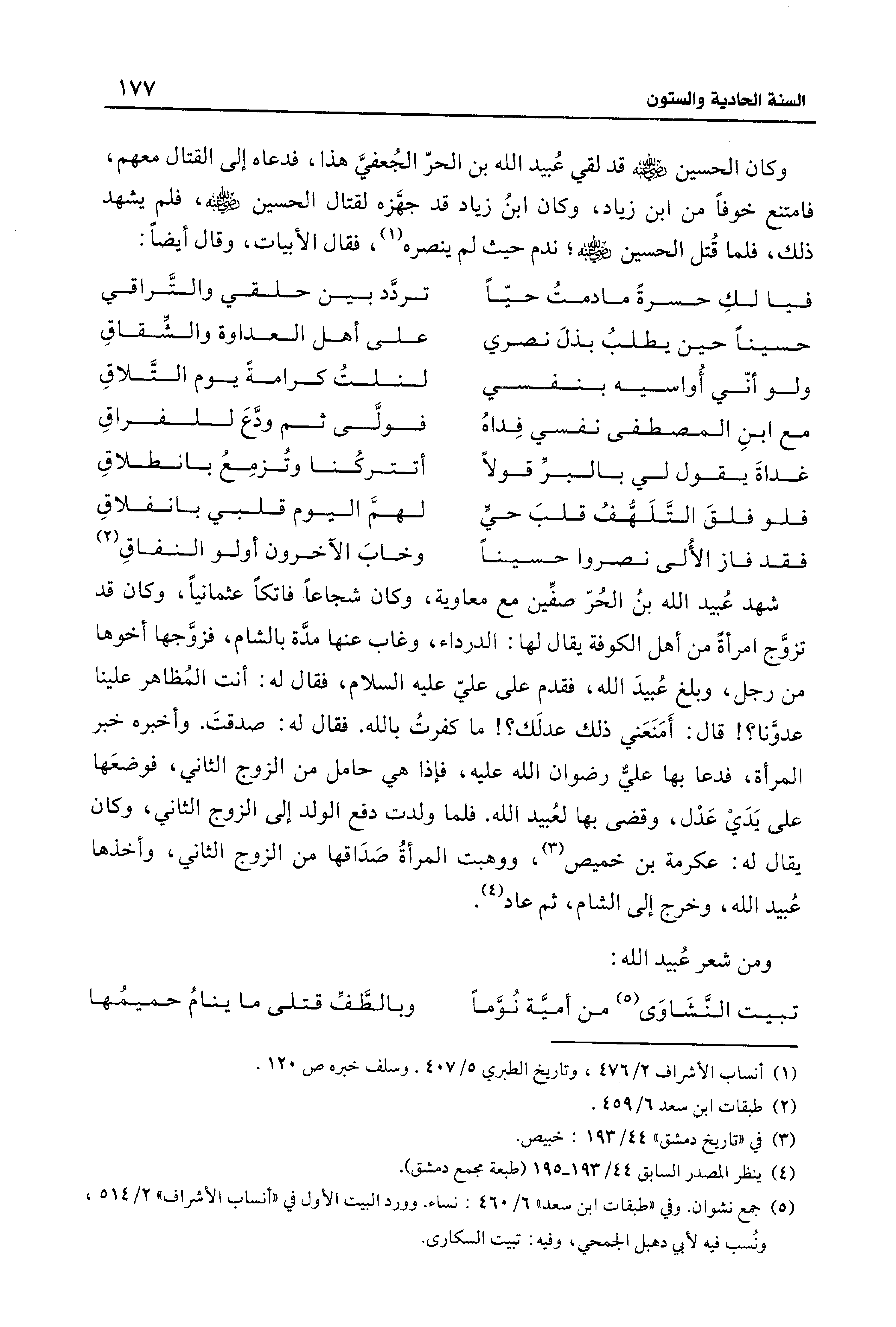 وكان الحسين - رضي الله عنه - قد لقي عُبيد الله بن الحرّ الجُعفيَّ هذا، فدعاه إلى القتال معهم، فامتنع خوفًا من ابن زياد، وكان ابنُ زياد قد جهَّزه لقتال الحسين - رضي الله عنه -، فلم يشهد ذلك، فلما قُتل الحسين - رضي الله عنه -؛ ندم حيث لم ينصره (¬1)، فقال الأبيات، وقال أيضًا: