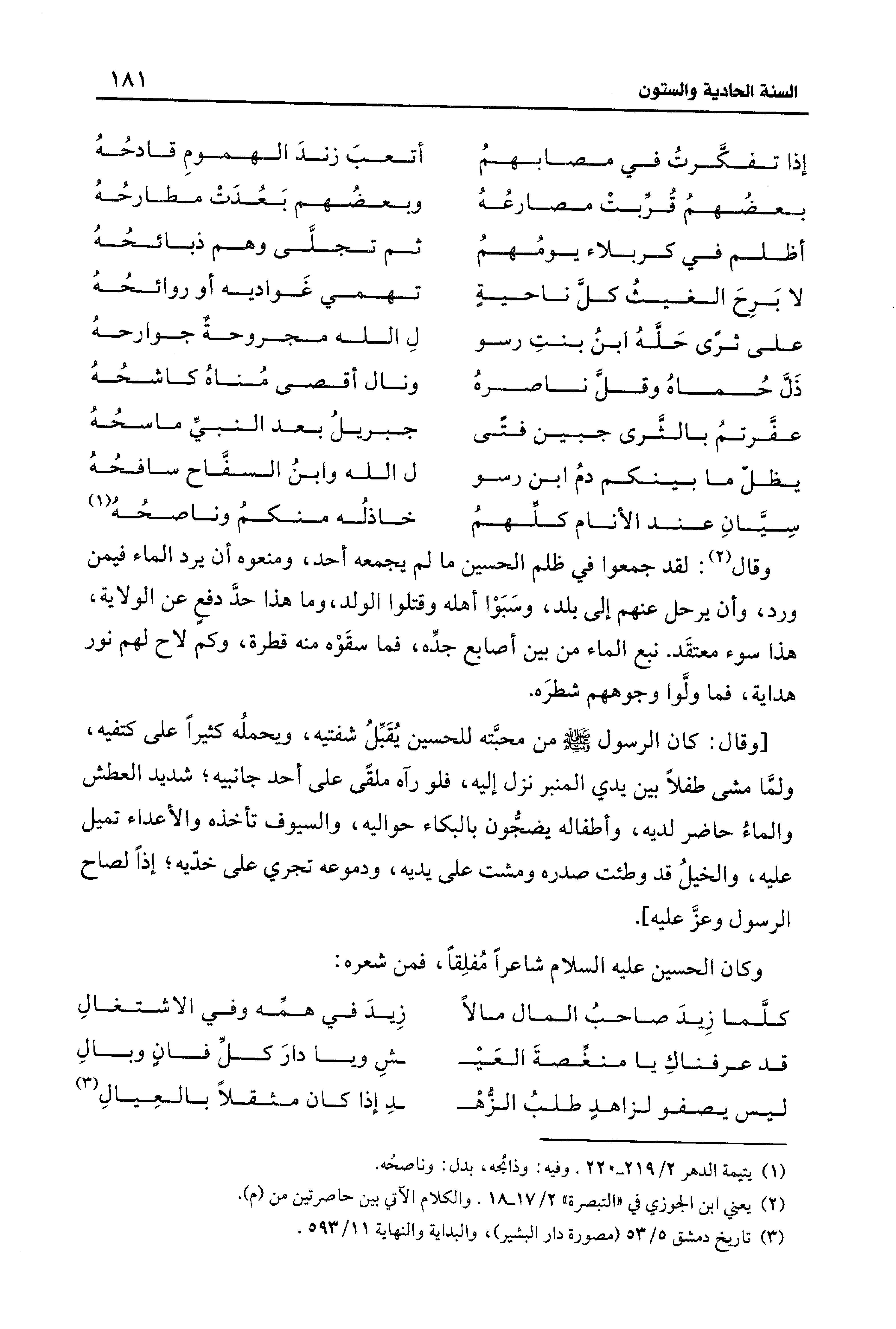 وقال (¬2): لقد جمعوا في ظلم الحسين ما لم يجمعه أحد، ومنعوه أن يرد الماء فيمن ورد، وأن يرحل عنهم إلى بلد، وسَبَوْا أهله وقتلوا الولد، وما هذا حدَّ دفعِ عن الولاية، هذا سوء معتقَد. نبع الماء من بين أصابع جدِّه، فما سقَوْه منه قطوة، وكم لاح لهم نور هداية، فما ولَّوا وجوههم شطرَه.