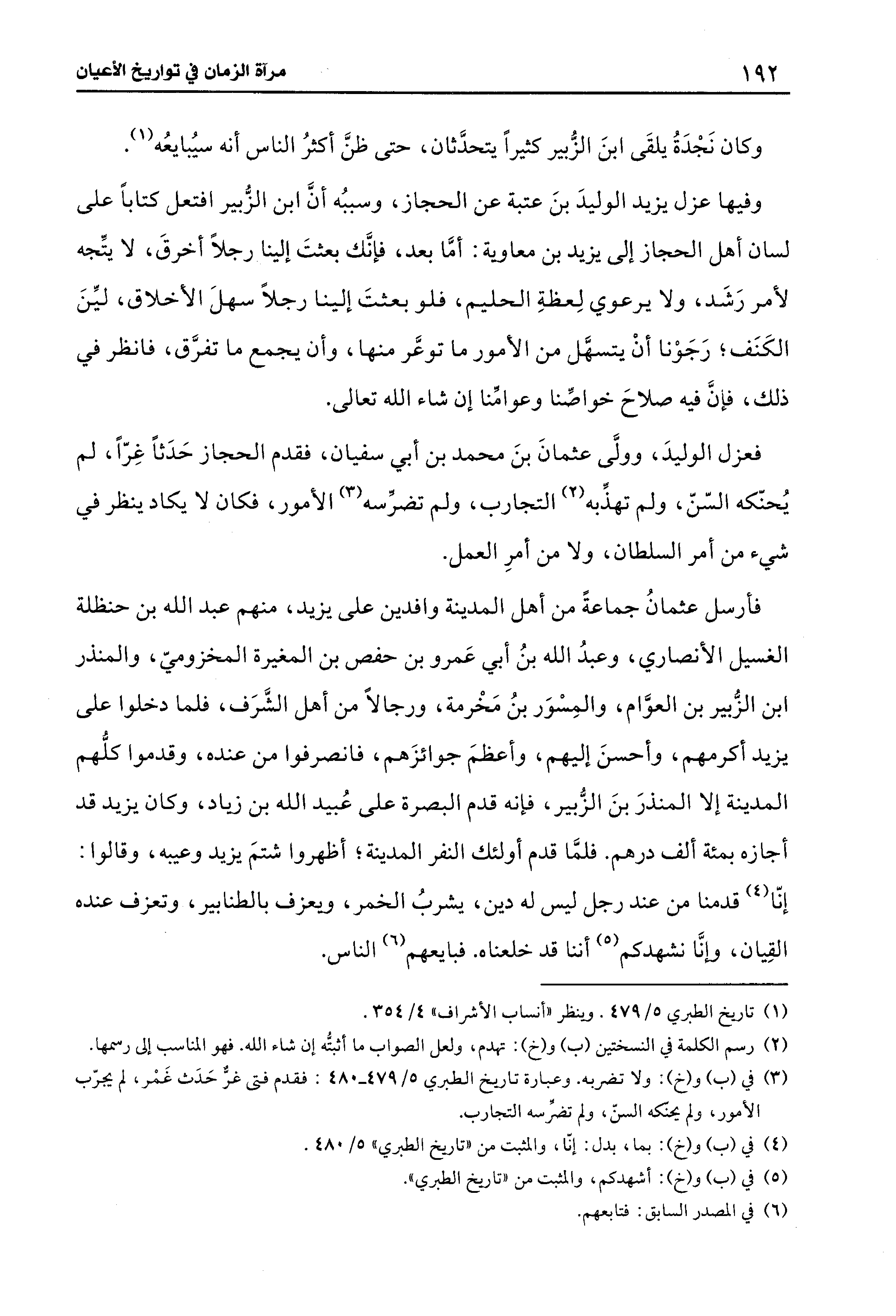فأرسل عثمانُ جماعةً من أهل المدينة وافدين على يزيد، منهم عبد الله بن حنظلة الغسيل الأنصاري، وعبدُ الله بنُ أبي عَمرو بن حفص بن المغيرة المخزوميّ، والمنذر بن الزبير بن العوَّام، والمِسْوَر بنُ مَخْرمة، ورجالًا من أهل الشَّرَف، فلما دخلوا على يزيد أكرمهم، وأحسنَ إليهم، وأعظمَ جوائزَهم، فا نصرفوا من عنده، وقدموا كلُّهم المدينة إلا المنذرَ بنَ الزُّبير، فإنه قدم البصرة على عُبيد الله بن زياد، وكان يزيد قد أجازه بمئة ألف درهم. فلمَّا قدم أولئك النفر المدينة؛ أظهروا شتمَ يزيد وعيبه، وقالوا: إنّا (¬4) قدمنا من عند رجل ليس له دين، يشربُ الخمر، ويعزف بالطنابير، وتعزف عنده القِيان، وإنَّا نشهدكم (¬5) أننا قد خلعناه. فبايعهم (¬6) الناس.