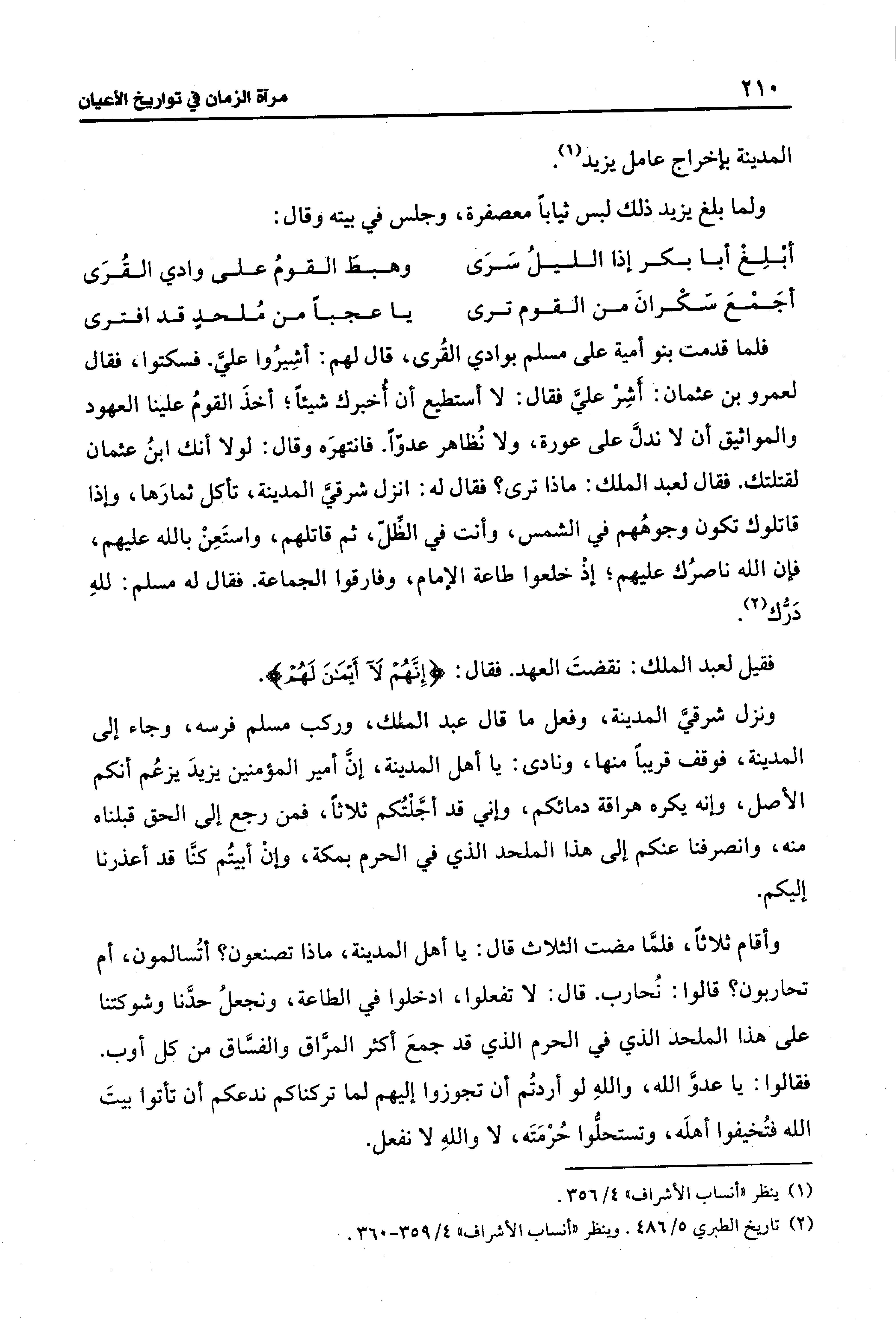 ونزل شرقيَّ المدينة، وفعل ما قال عبد الملك، وركب مسلم فرسه، وجاء إلى المدينة، فوقف قريبًا منها، ونادى: يا أهل المدينة، إنَّ أمير المؤمنين يزيدَ يزعُم أنكم الأصل، وإنه يكره هراقة دمائكم، وإني قد أجَّلْتُكم ثلاثًا، فمن رجع إلى الحق قبلناه منه، وانصرفنا عنكم إلى هذا الملحد الذي في الحرم بمكة، وإنْ أبيتُم كنَّا قد أعذرنا إليكم.