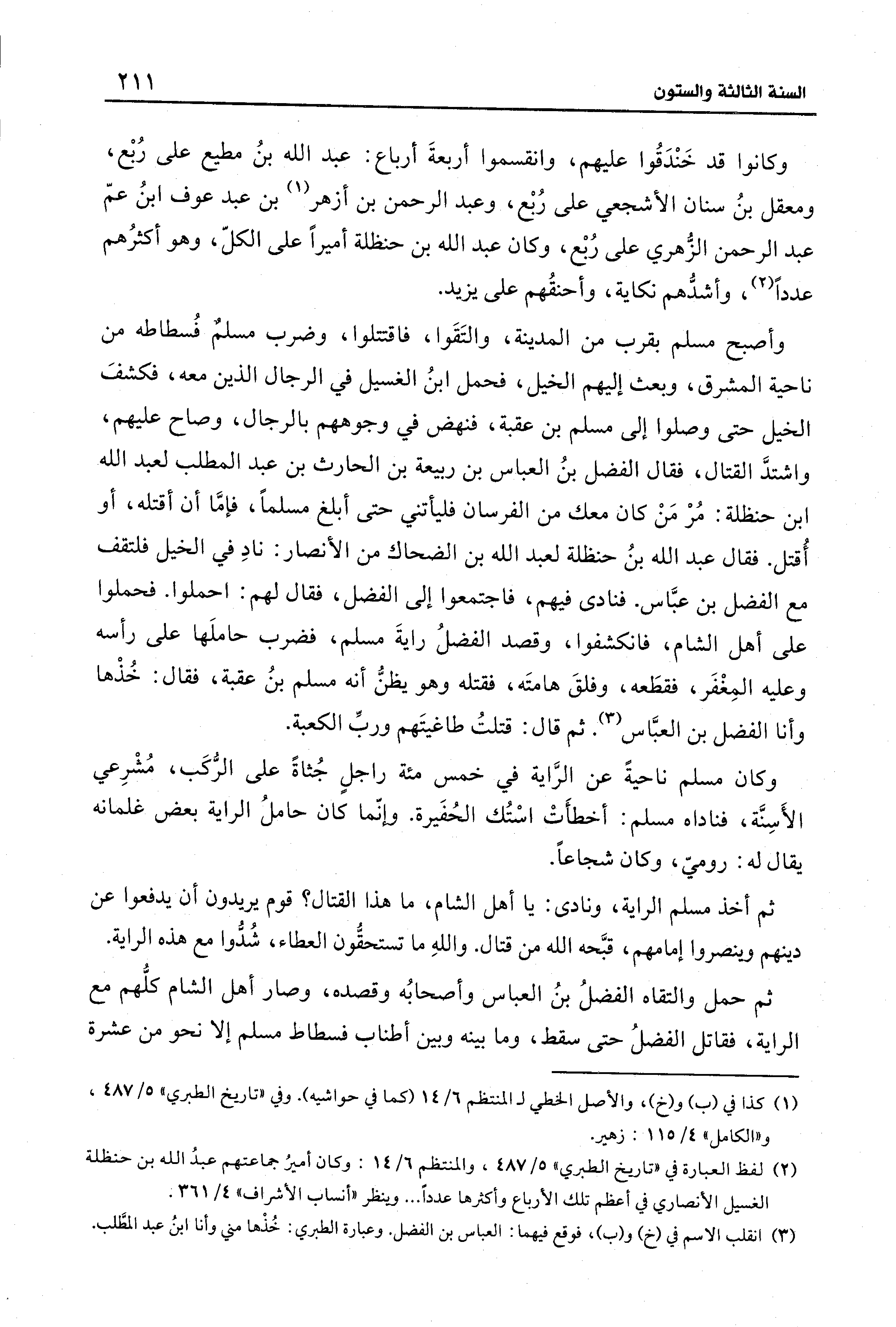 وأصبح مسلم بقرب من المدينة، والتَقَوا، فاقتتلوا، وضرب مسلمٌ فُسطاطه من ناحية المشرق، وبعث إليهم الخيل، فحمل ابنُ الغسيل في الرجال الذين معه، فكشفَ الخيل حتى وصلوا إلى مسلم بن عقبة، فنهض في وجوههم بالرجال، وصاح عليهم، واشتدَّ القتال، فقال الفضل بنُ العباس بن ربيعة بن الحارث بن عبد المطلب لعبد الله بن حنظلة: مُرْ مَنْ كان معك من الفرسان فليأتني حتى أبلغ مسلمًا، فإمَّا أن أقتله، أو أُقتل. فقال عبد الله بنُ حنظلة لعبد الله بن الضحاك من الأنصار: نادِ في الخيل فلتقف مع الفضل بن عبَّاس. فنادى فيهم، فاجتمعوا إلى الفضل، فقال لهم: احملوا. فحملوا على أهل الشام، فانكشفوا، وقصد الفضلُ رايةَ مسلم، فضرب حاملَها على رأسه وعليه المِغْفَر، فقطَعه، وفلقَ هامتَه، فقتله وهو يظنُّ أنه مسلم بنُ عقبة، فقال: خُذْها وأنا الفضل بن العبَّاس (¬3). ثم قال: قتلتُ طاغيتَهم وربِّ الكعبة.