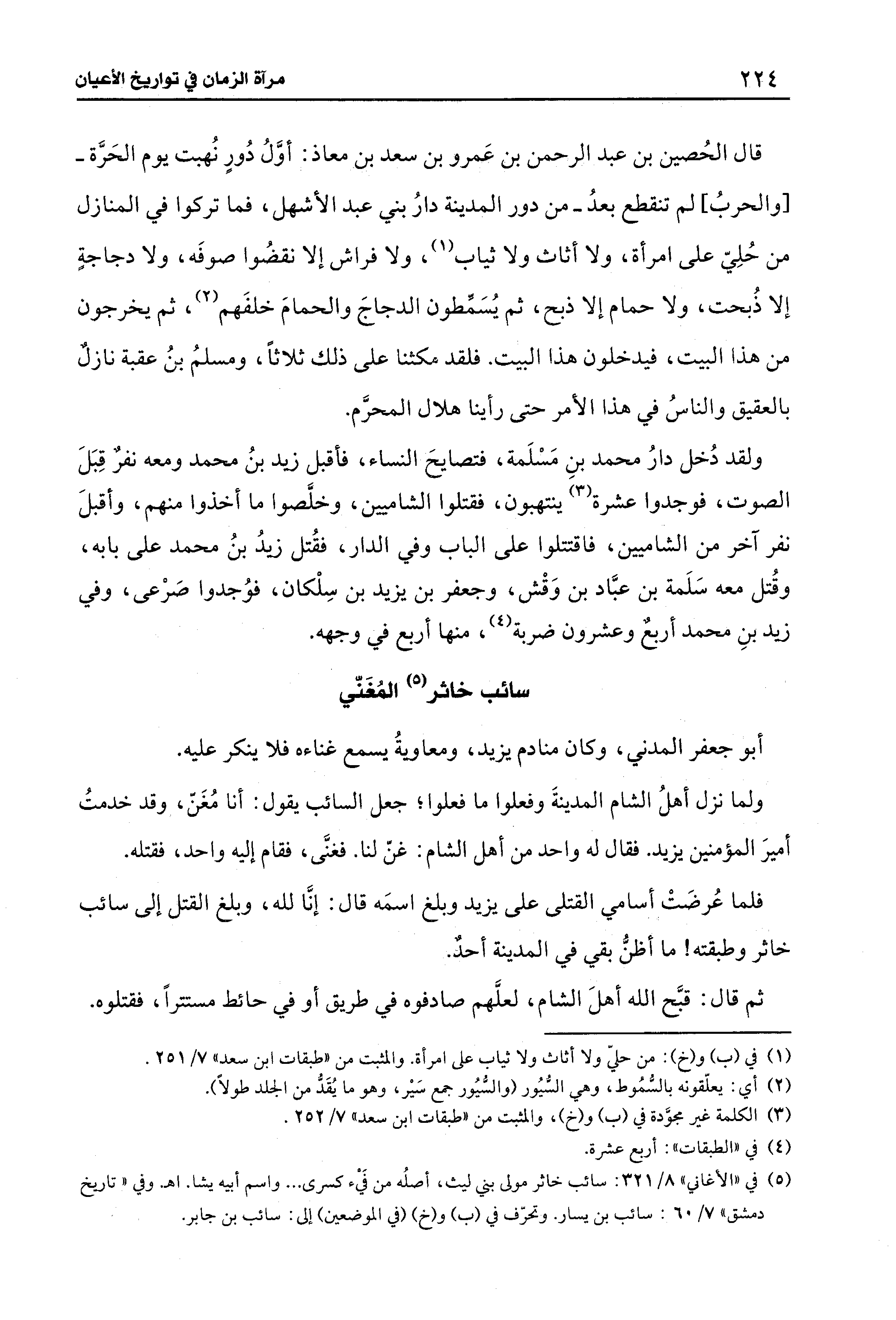 ولما نزل أهلُ الشام المدينةَ وفعلوا ما فعلوا؛ جعل السائب يقول: أنا مُغَنّ، وقد خدمتُ أميرَ المؤمنين يزيد. فقال له واحد من أهل الشام: غنّ لنا. فغنَّى، فقام إليه واحد، فقتله.